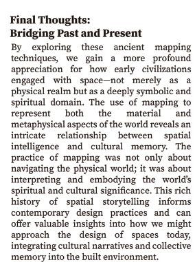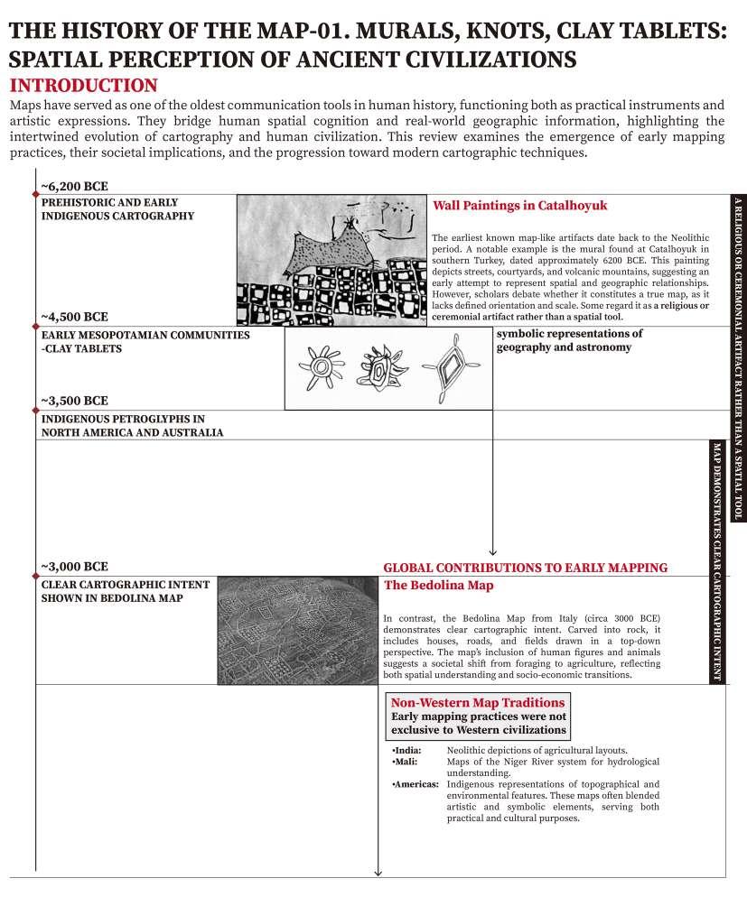 By studying Indigenous rock art, we see how early humans documented their world, from natural elements to social activities such as hunting and sacrificial rituals. These carvings range from static recordings to dynamic displays, integrating time and seasons into their representations. Across different regions, petroglyph reveal diverse formats and approaches to recording the world. Yet, despite these differences, they share something universal: they reflect the personalities and worldviews of the people who created them, their understanding of society, nature, the universe, and themselves. All of this points to a common conclusion: spatial intelligence enabled humans to reinterpret their world, and the concentrated outcome of this reinterpretation is the map.