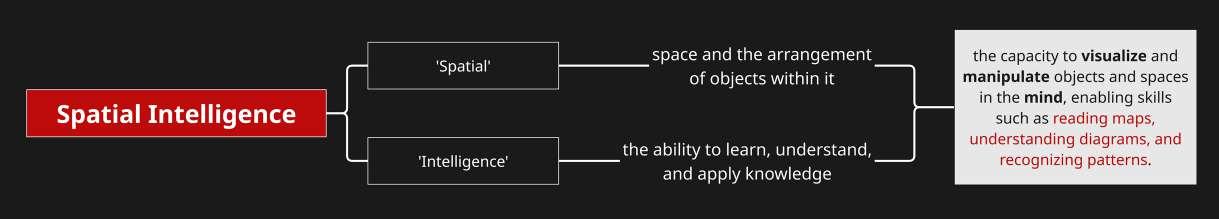 This research begins with the exploration of ‘spatial intelligence.’ The term combines ‘spatial’, which relates to space and the arrangement of objects within it, with “intelligence,” which refers to the ability to learn, understand, and apply knowledge. Together, ‘spatial intelligence’ describes the human capacity to visualize and manipulate objects and spaces in the mind, enabling skills such as reading maps, understanding diagrams, and recognizing patterns.
