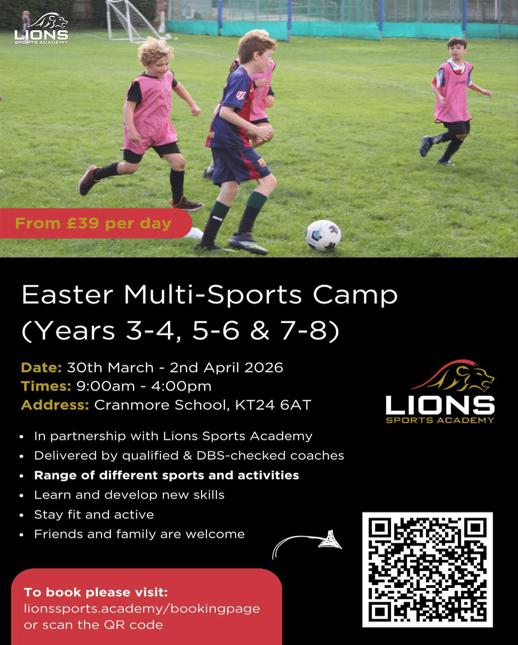Lions Sports Academy are hosting an Easter Camp at Cranmore from 30th March to 2nd April. Please see flyer and booking link below. Cranmore parents can get a 15% discount using the code: Cranmore15 https://lionssports academy/bookingpage/School-Camp/Cranmore-School