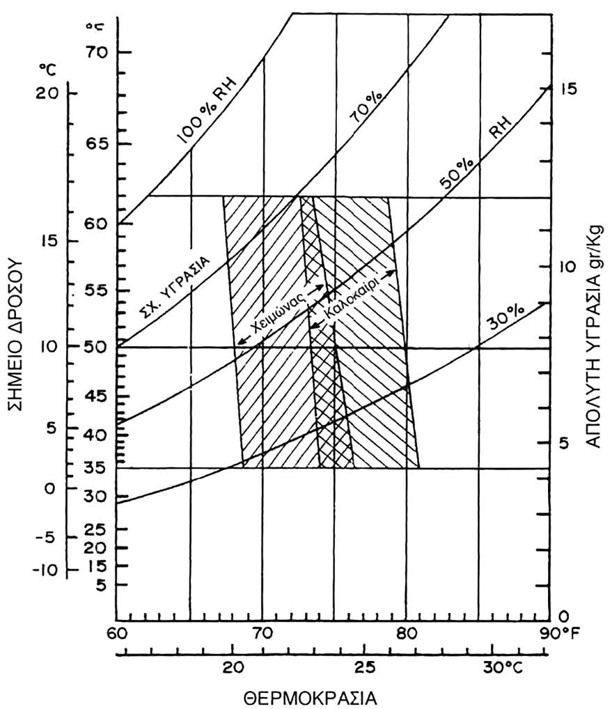 ε . Η υγρασία του αέρα χώρων κατά τη διάρκεια του χειμώνα πρέπει να κυμαίνεται σε επίπεδα από ό , τι του καλοκαιριού , για να αποφεύγονται συμπυκνώσεις υδρατμών σε κρύες επιφάνειες .