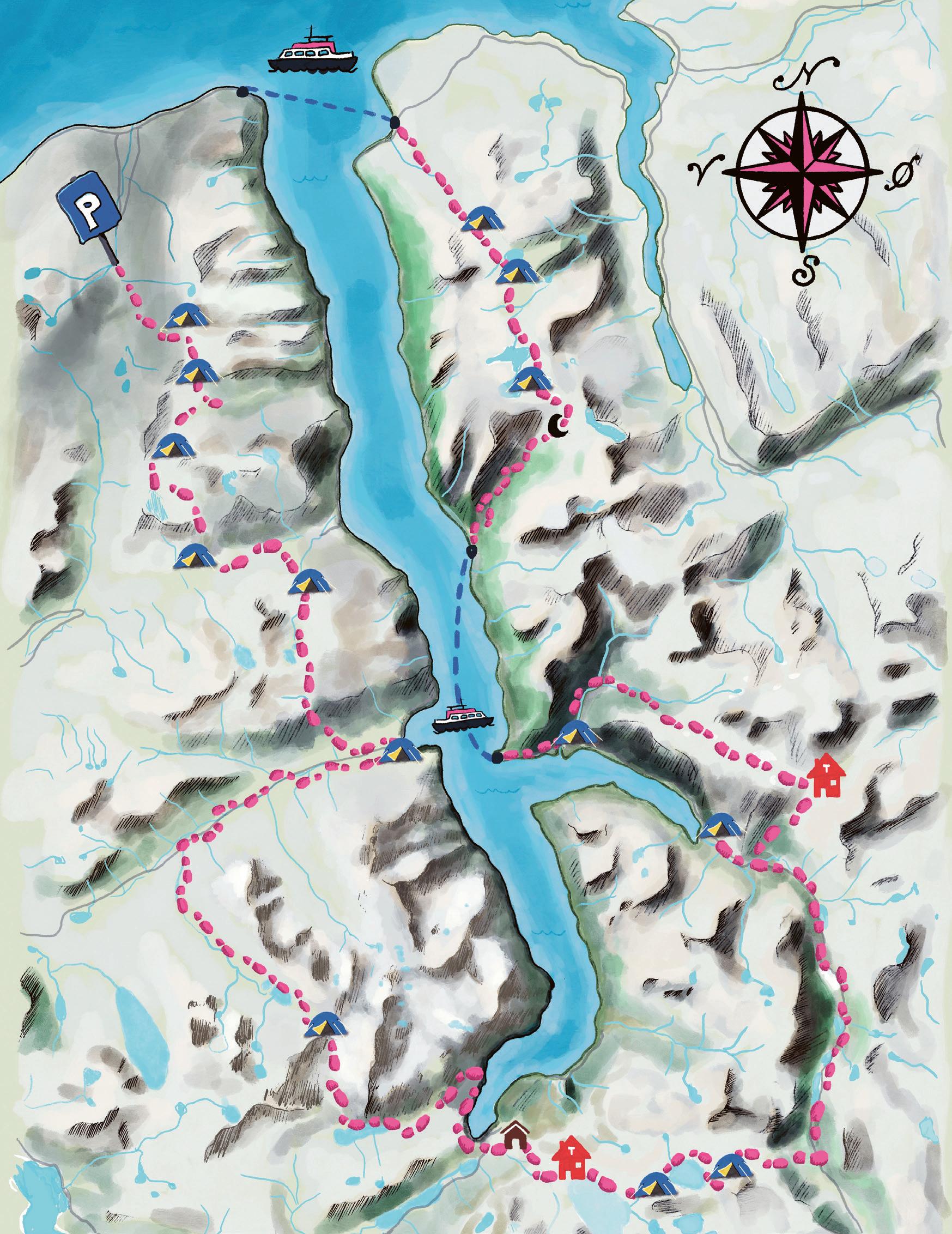 Turen du nå skal bli med oss på er fra 2019, da Mina og jeg vandret rundt vakre Hjørund fjorden i Sunnmørsalpene i 21 dager. Mina var tre år og ti måneder på denne turen. Og Laura, så klart. Dukken til Mina er med oss på alle våre turer rundt omkring i vårt vakre kongerike. Bildene i boken er både fra langturen i 2019 og fra da vi dro tilbake til samme fjord tre år senere. Underveis i fortellingen vil du finne QR-koder med korte filmsnutter fra turen vår i 2019.