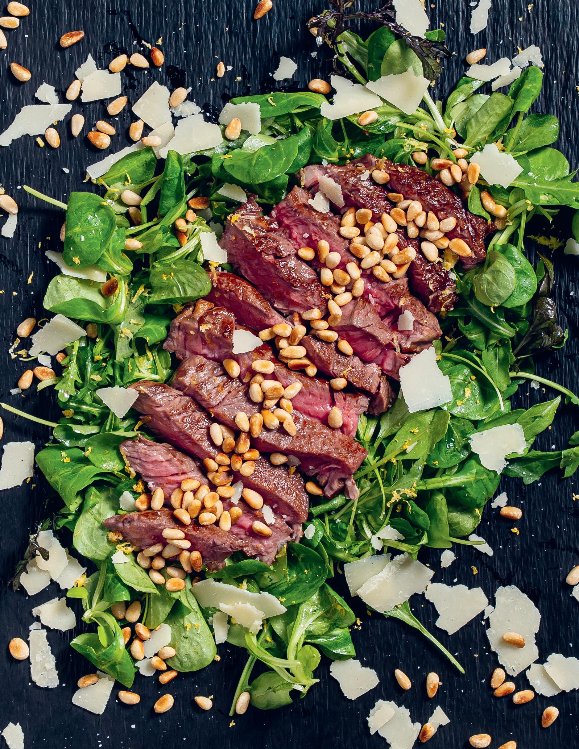 Retten ble servert og igjen ble jeg slått i bakken av det italienske kjøkken. På det minst sannsynlige stedet fikk jeg servert perfekt stekt kjøtt, med sprø ruccola og høvlede skiver av parmesan. Tagliata di manzo er en perfekt rett å dele, den er ren i smakene og metter godt uten å bli for tung. Her har jeg brukt Feldtsalat istedenfor ruccola, men dette er valgfritt. Den er en av mine personlige favoritter, og jeg håper den blir det for deg også.