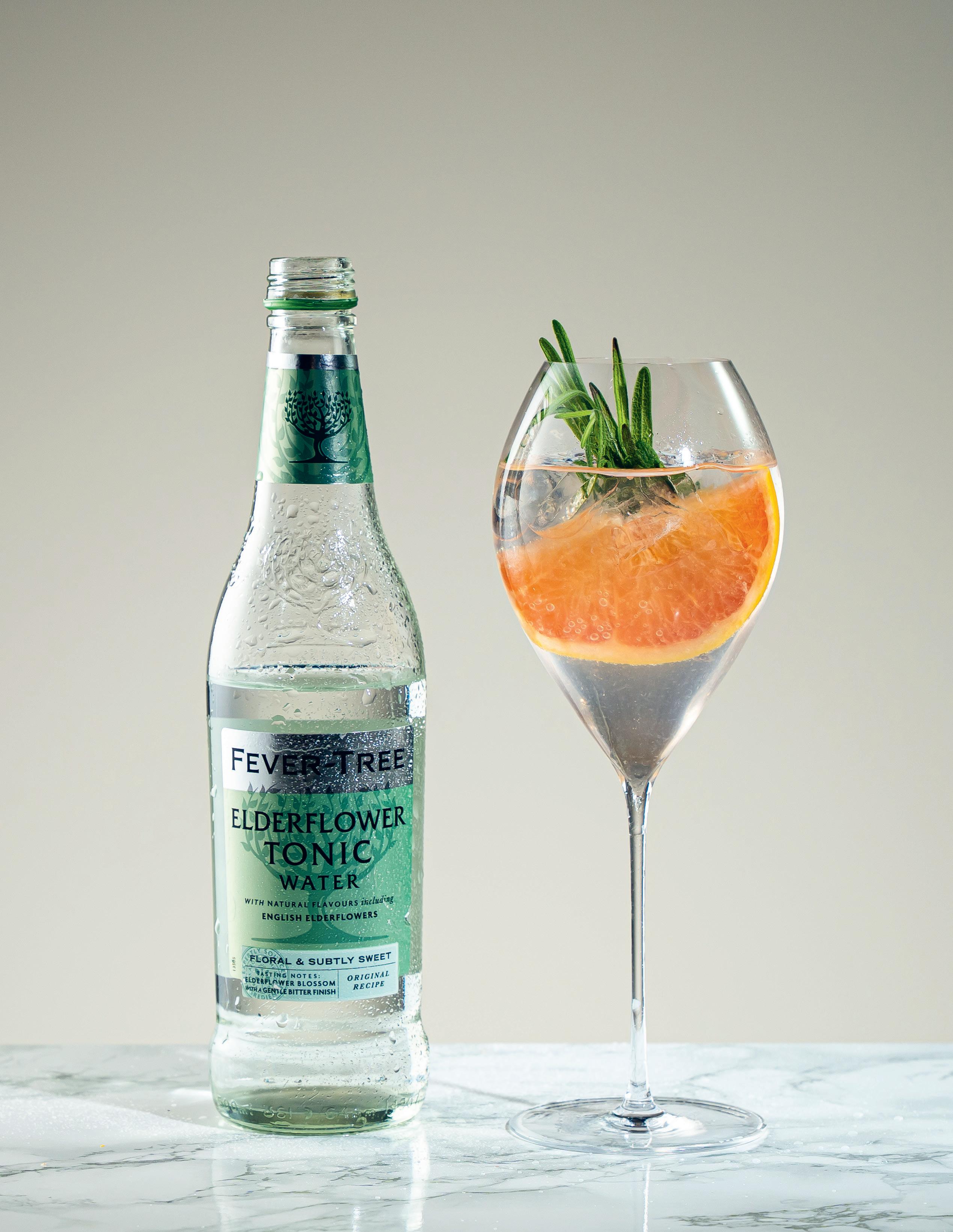 Ha isbiter, gin og saft fra grapefrukt i et vinglass. Topp med tonic og pynt med en skive grapefrukt og en kvast rosmarin.