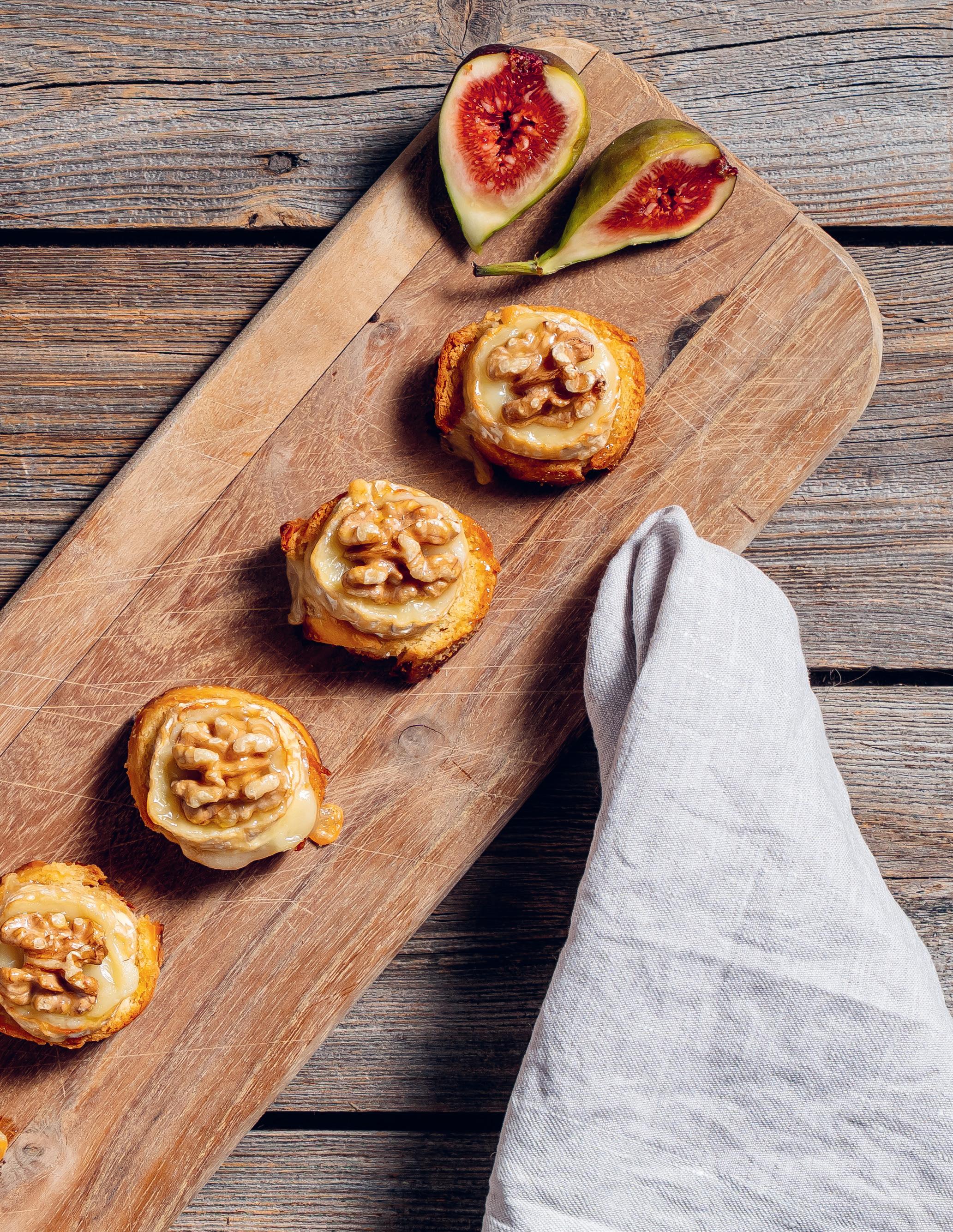 Under steketiden plukker du frem en hel valnøtt til hver toast og skjærer fikenene i båter.