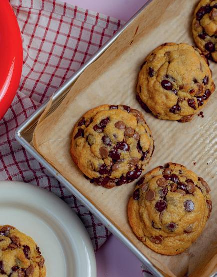 1. Skjær det kalde smøret i terninger. Ha så smør og brunt og hvitt sukker i en bolle. Bruk deigverktøyet/mørdeigsvisperen som hører til kjøkkenmaskinen, og rør til du får en kremet konsistens hvor sukkerkornene ikke lenger er synlige. Ha i egg og visp til alt er blandet, men ikke visp mer enn nødvendig. Tilsett hvetemel, bakepulver og salt. Bland dette sammen til du får en chunky konsistens og det ikke lenger er noen synlige melstriper.