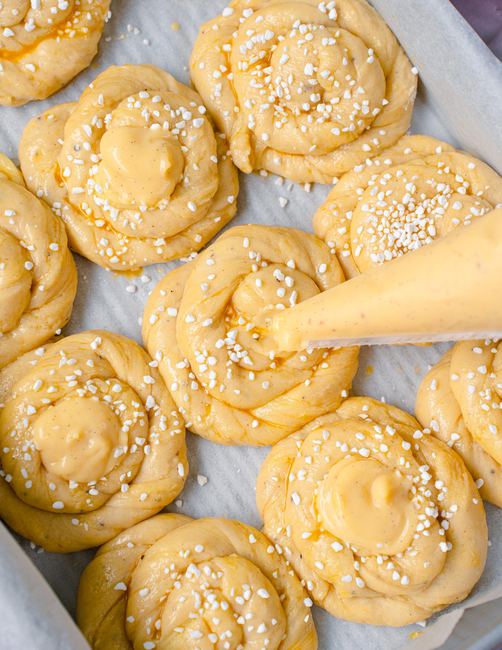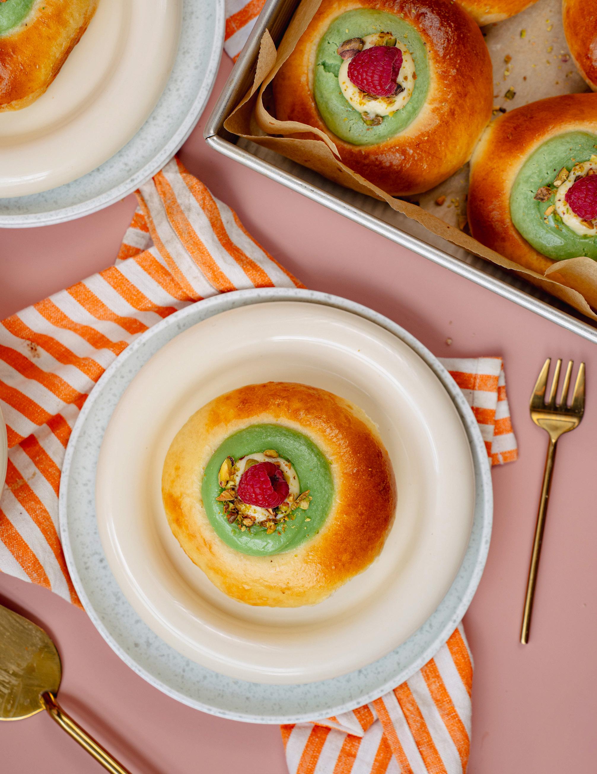 3. Pisk sammen alle ingrediensene til kremostfyllet. Bruk et glass som du trykker ned i hver bolle og fyll hver grop. Stek på 175 °C varmluft i 15–20 minutter. Når bollene er avkjølt, kan du strø over hakkede pistasjnøtter og bringebær.