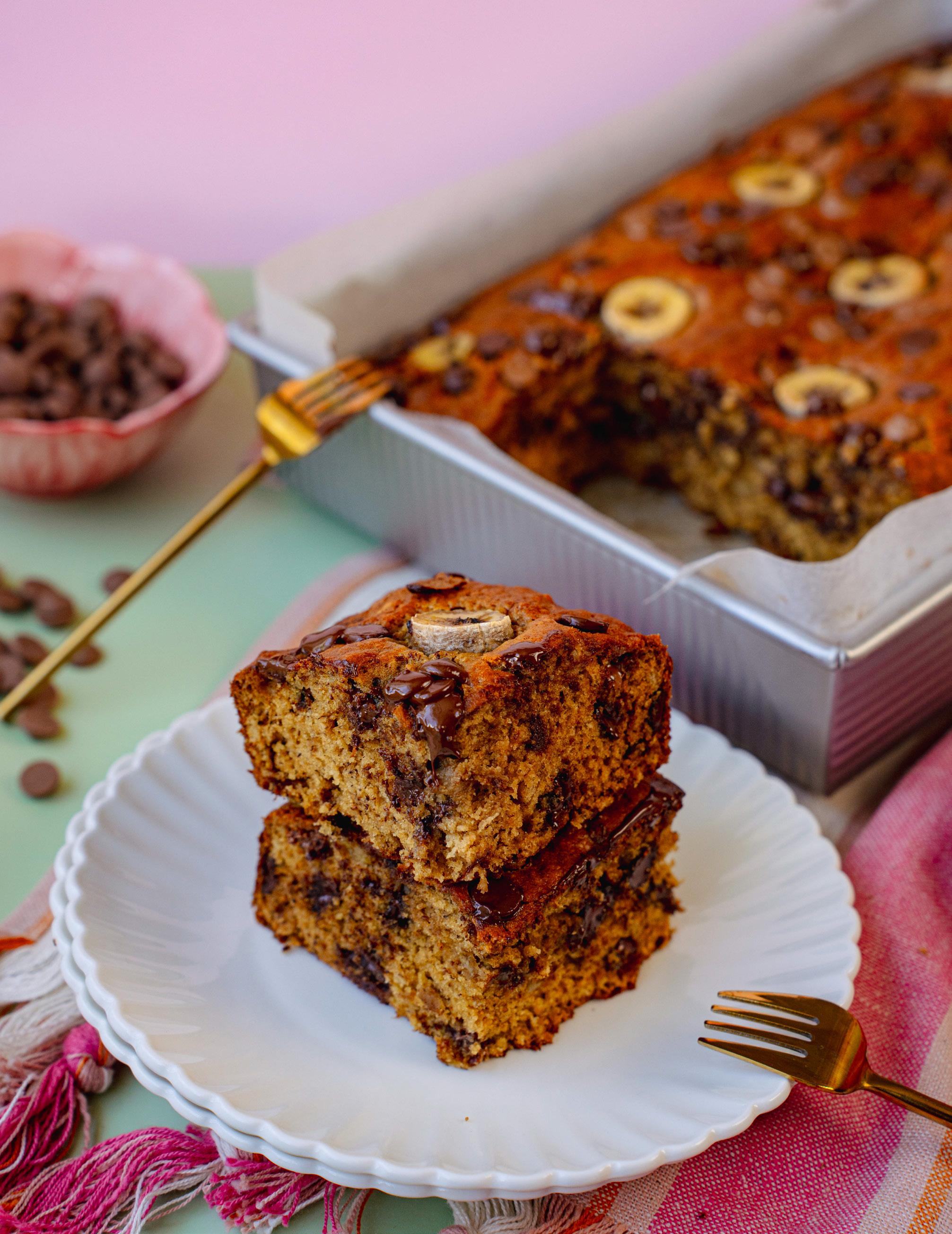 blir det enda bedre. Dette bananbrødet i langpanne er saftig og fullt av sjokoladebiter.