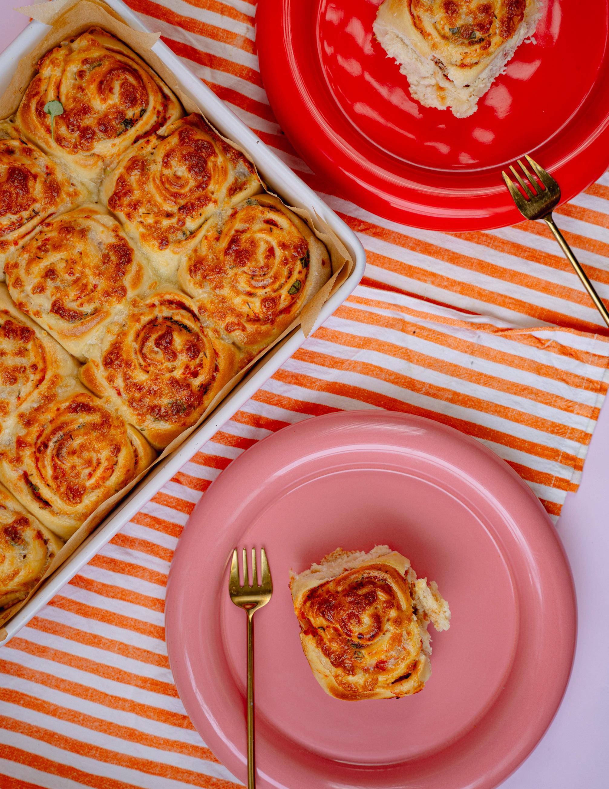 3. Kjevle deigen ut til et stort rektangel. Smør tomatsaus over hele deigen. Krydre med oregano, hvitløkpulver, salt og pepper. Strø over frisk basilikum, mozzarella og parmesan. Rull sammen til en pølse og kutt i 12 like store emner. Ha over i en bakepapirkledd langpanne og la heve ca. 1 time eller til dobbel størrelse.
