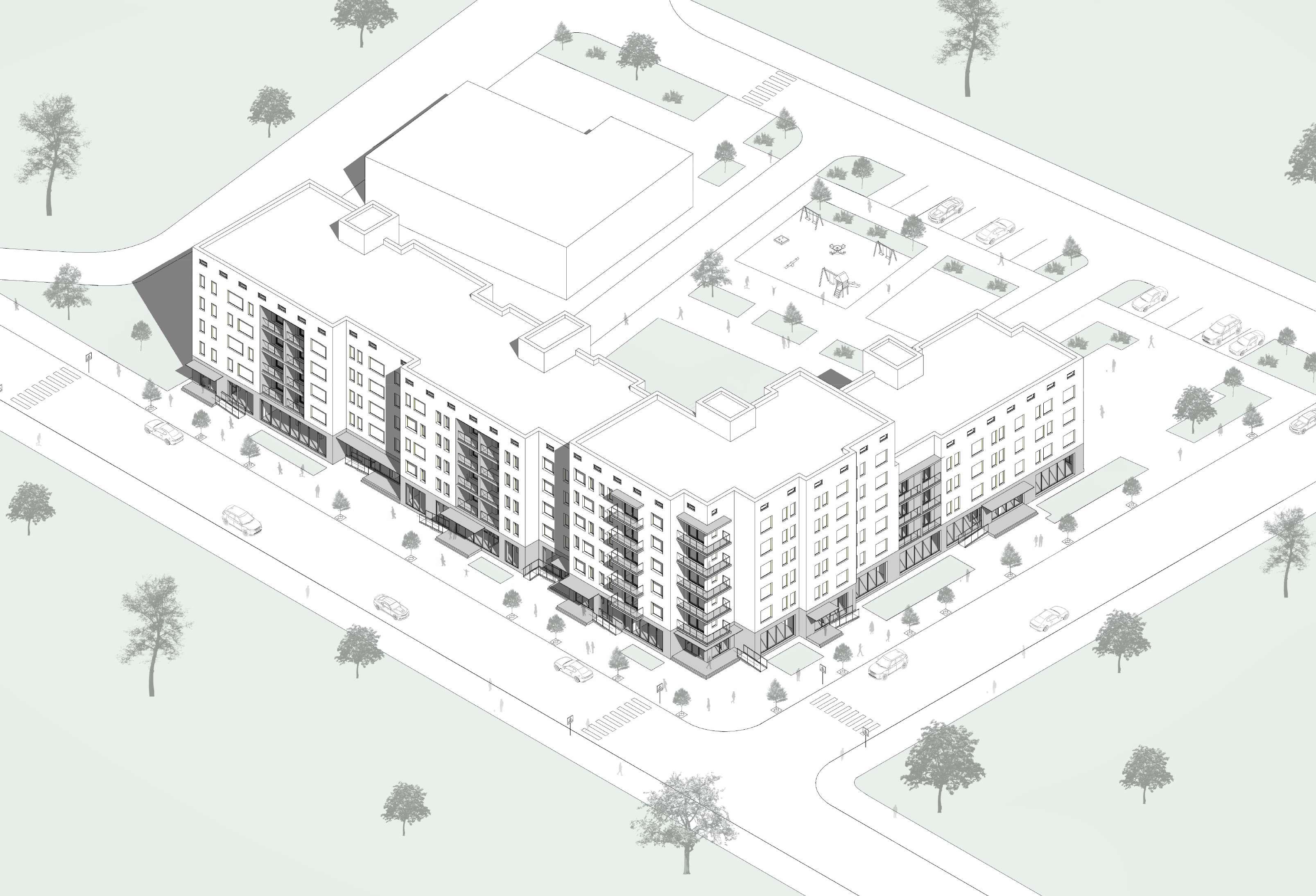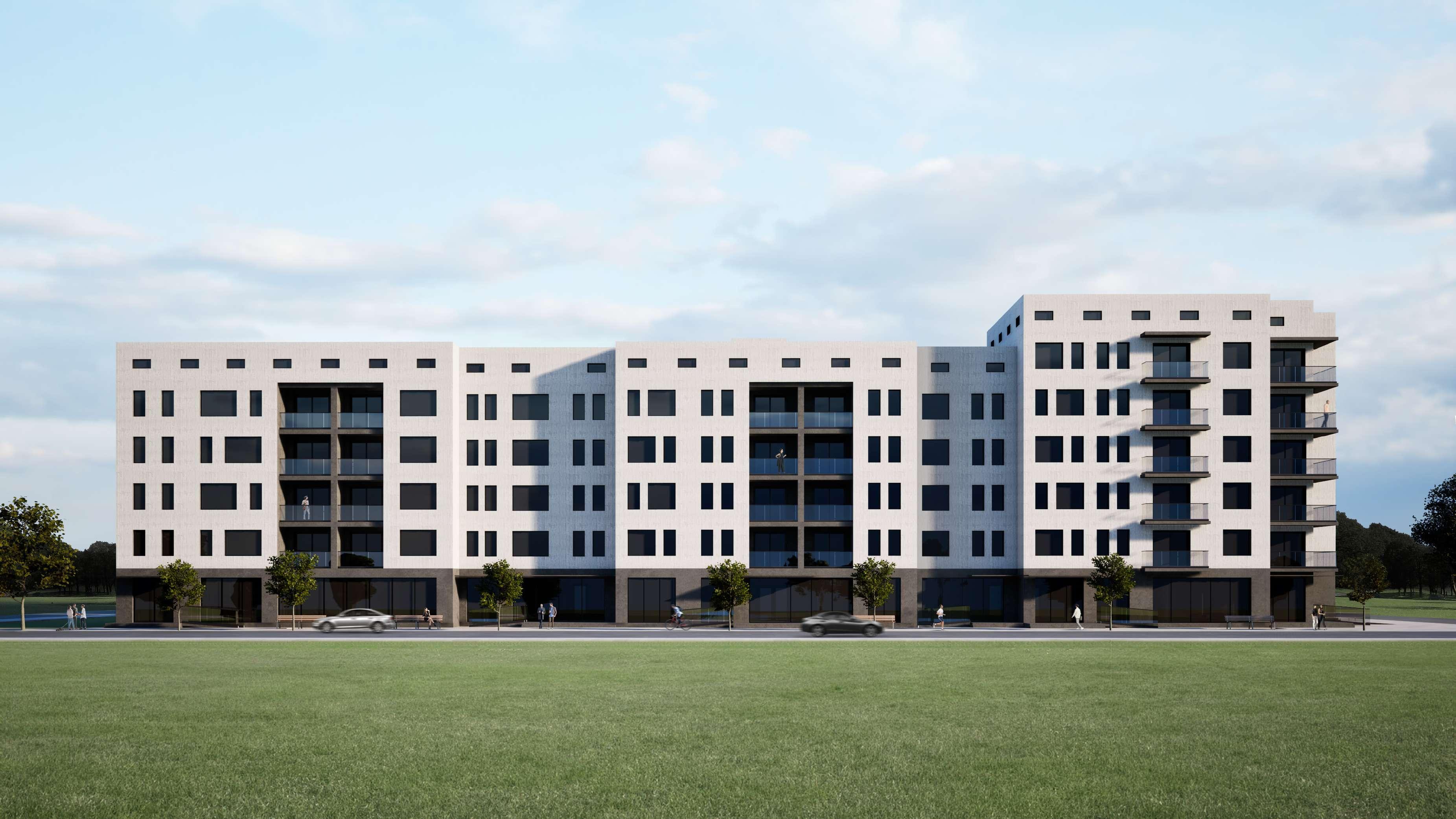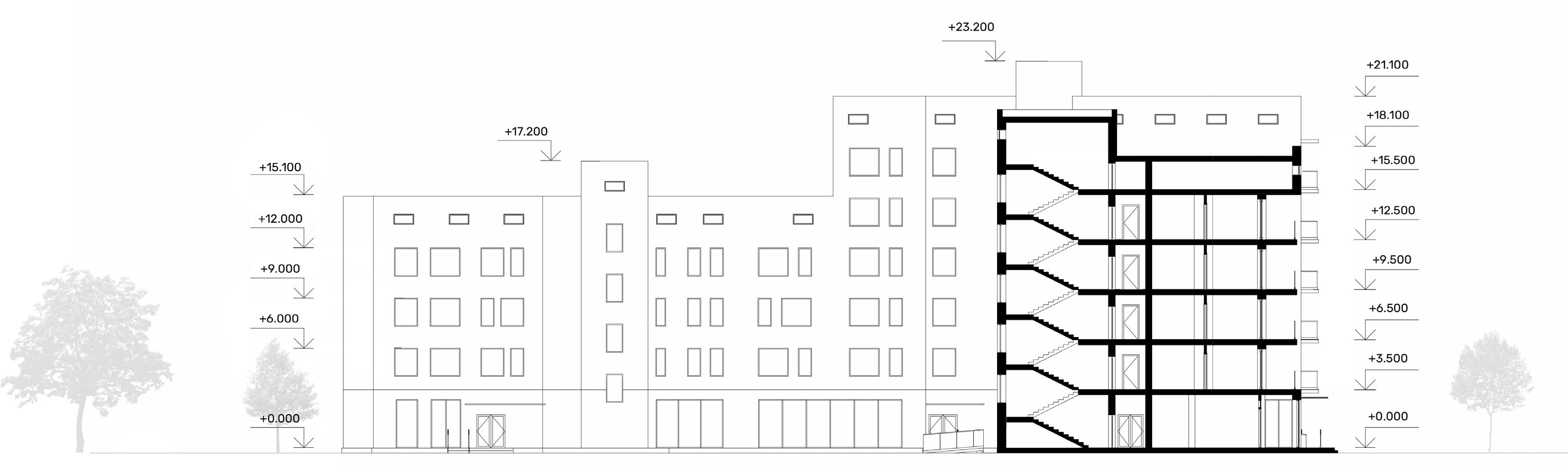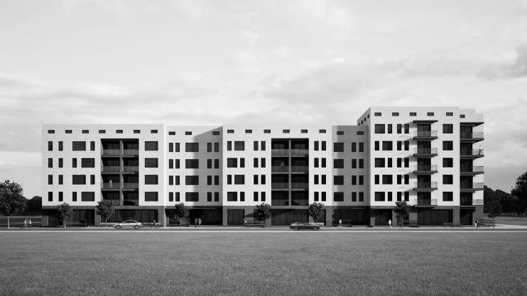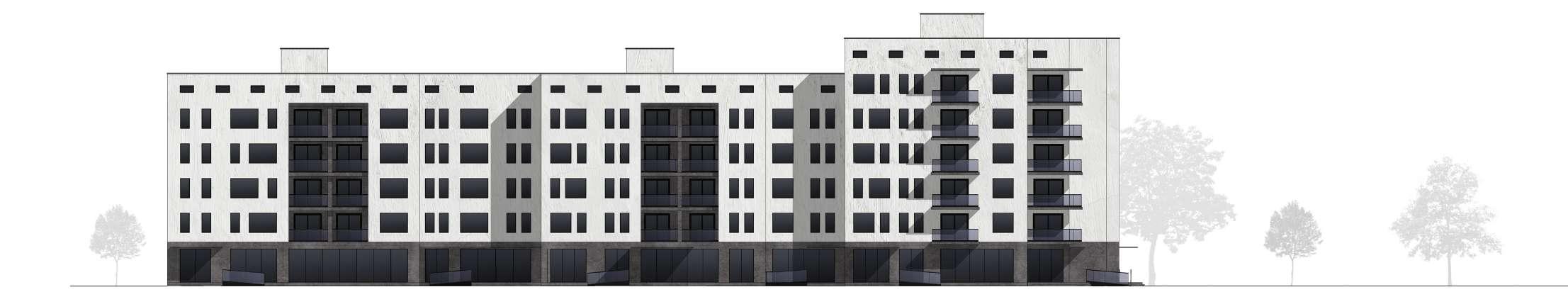 02 Багатоквартирний житловий будинок середньої поверховості на 4 секції розташований на ділянці в місті Гостомель, напроти вулиці Остромирська, маючи на території наявну забудову - продуктовий магазин. У проєкті продумані зручні й функціональні планувальні рішення, що забезпечують максимальний комфорт мешканцям і гарний показник інсоляції. На фасадах будинку розташовано 3 типи вікон, які створюють між собою метричні ряди композиції. Перший поверх відведений під комерційні приміщення, а в підʼїзді мешканців будинку розташована кімната для охорони, колясочна та технічне приміщення електрощитової.
