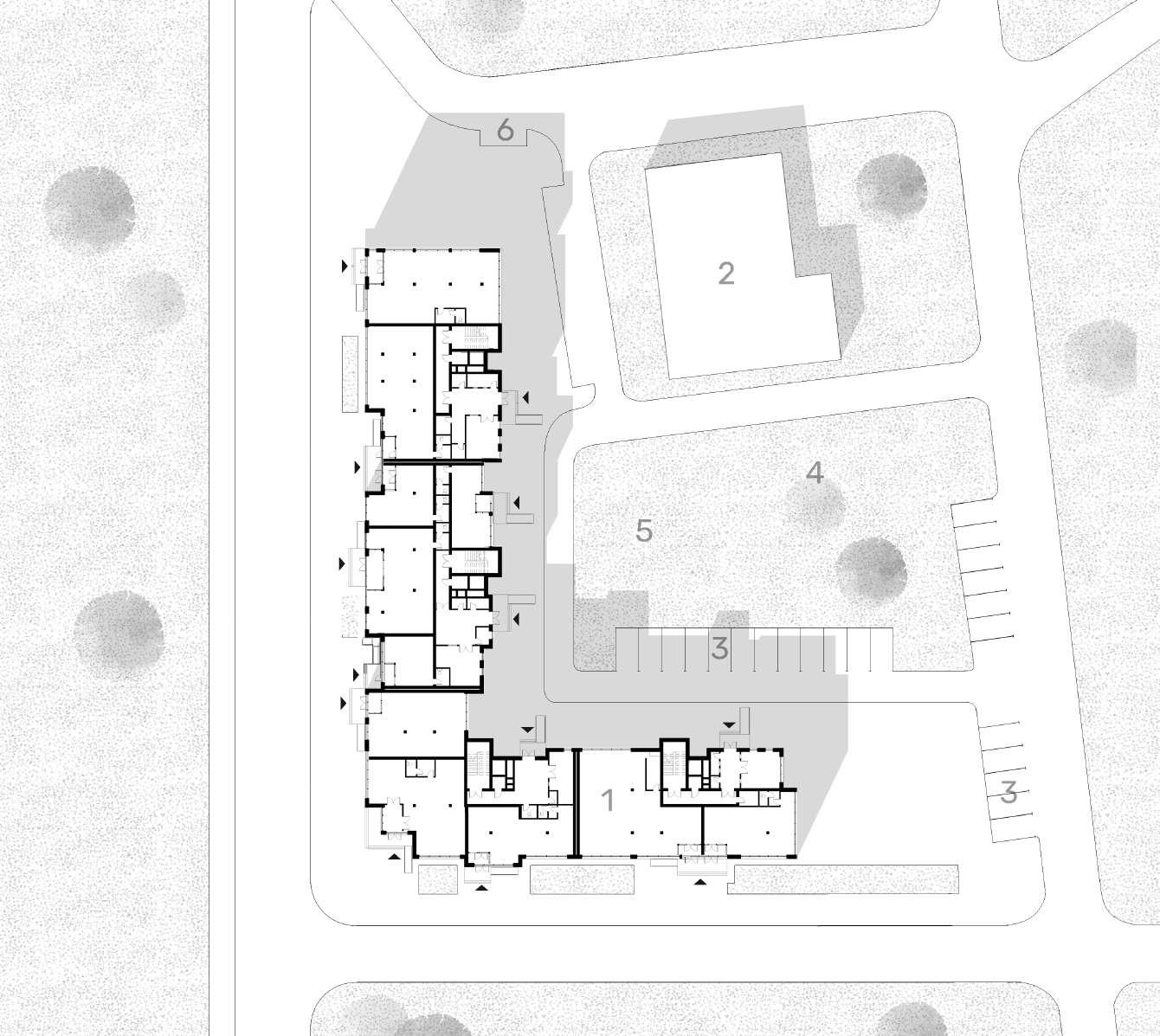 У проєкті використана секційна планувальна структура зі стінової конструктиної системою. Ділянка знаходиться в зоні 5-9 поверхової забудови із спокійним рельєфом. На території навколо будинку розташовані різноманітні зони для відпочинку та розваг. Це включає в себе дитячий майданчик, місце відпочинку дорослих, зелену зону, окремо відведені сміттєві баки, спортивний майданчик та місце для прогулянок з домашніми тваринами. Для зручності мешканців передбачені асфальтовані доріжки і паркові місця. Також наявні зелені насадження, квітучі клумби та дерева, які створюють природний баланс та сприяють здоровому й активному способу життя мешканців. Південний фасад Поперечний розріз 21 1. Будинок 2. Існуюча забудова 3. Парковка 4. Дитячий майданчик 5. Спортивна зона 6. Сміттєві баки ЛЕГЕНДА ДО ГЕНЕРАЛЬНОГО ПЛАНУ