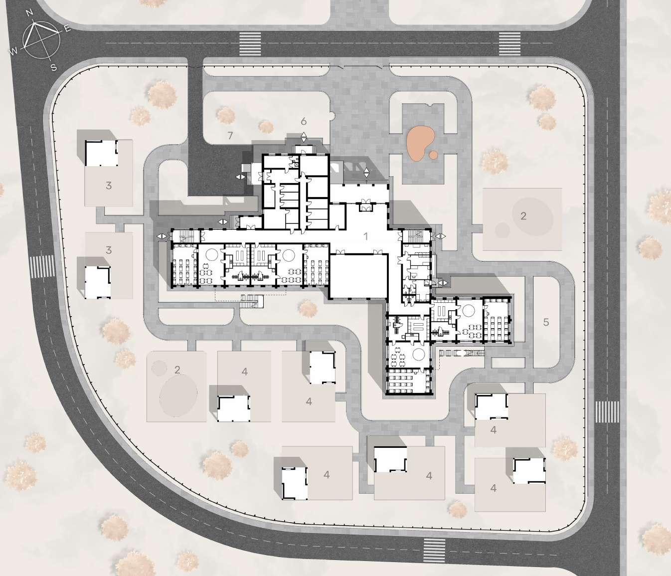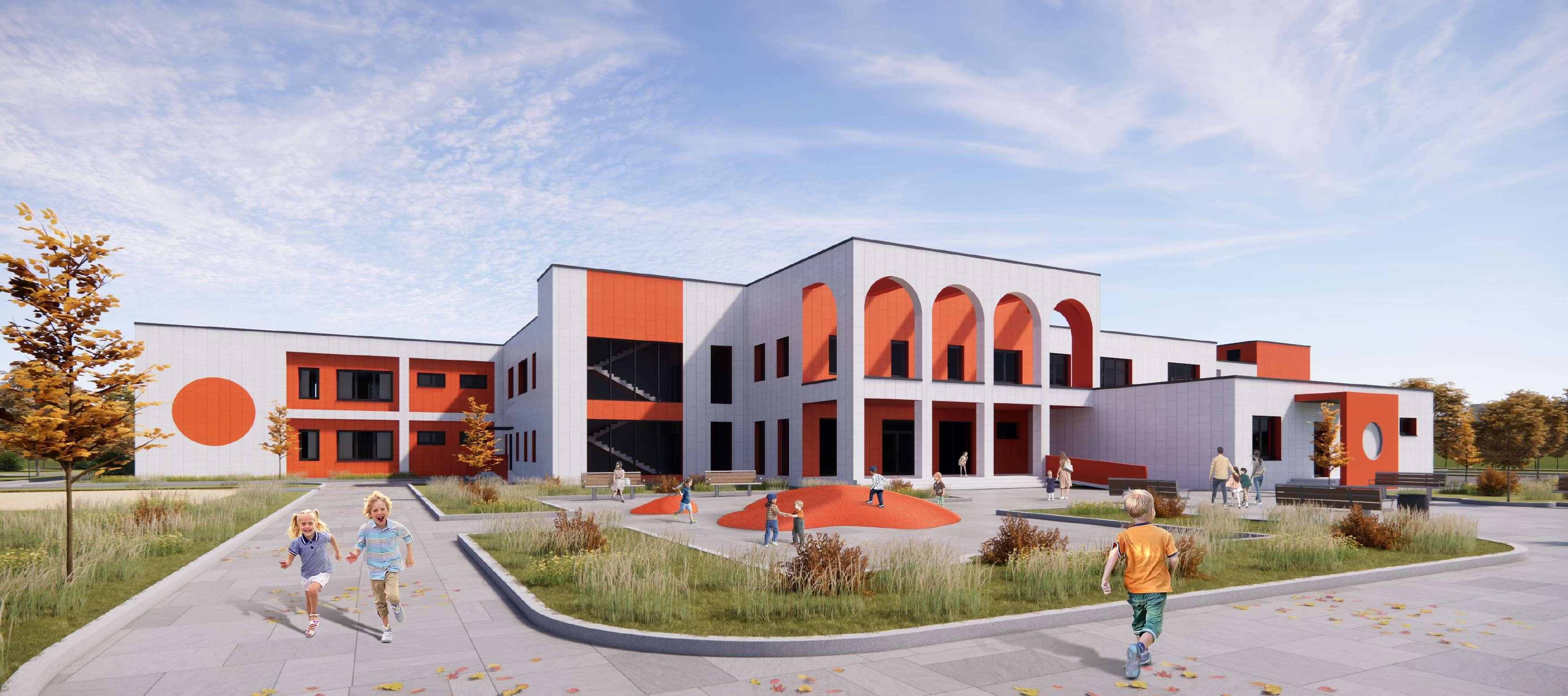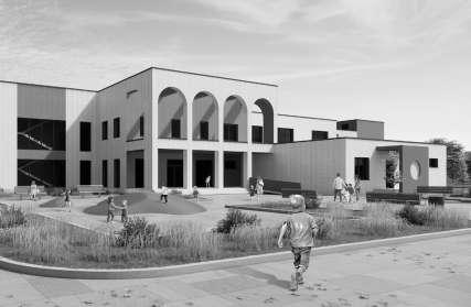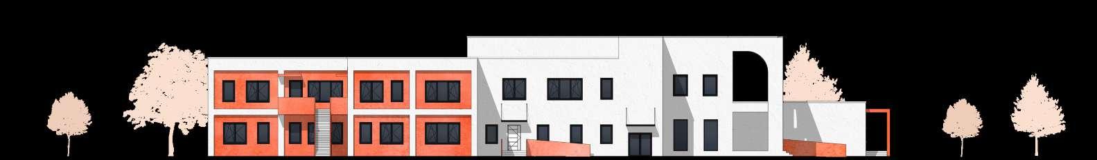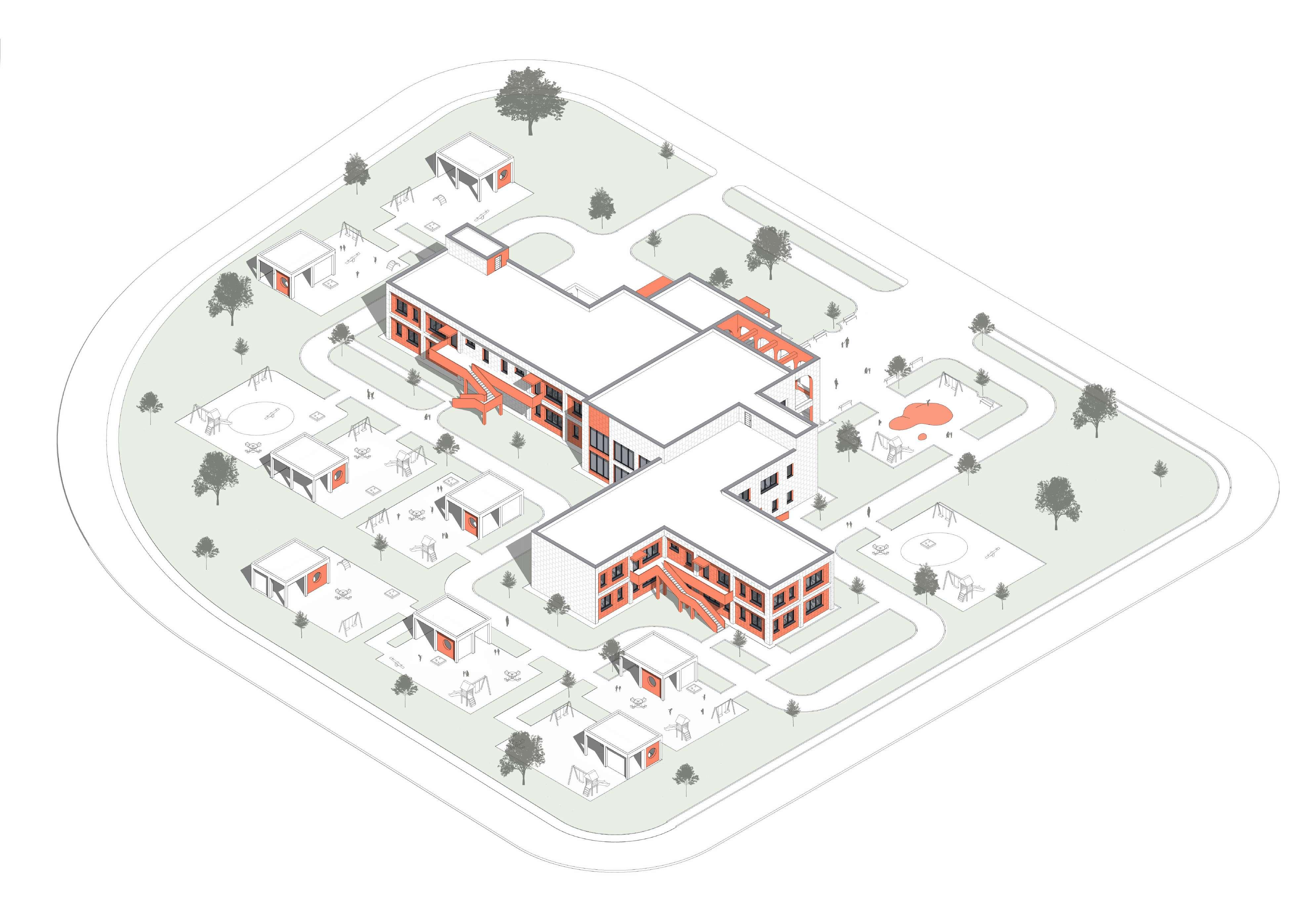 01 Проєкт закладу дошкільної освіти на 160 місць загального типу розташований на Троещині, серед житлової забудови. Архітектурно-планувальне рішення будівлі базується навколо дитячих осередків, поєднуючи в собі ігрові, службово-побутові, медичні й інші приміщення. У художньому образі враховано значність впливу архітектури на формування особистості дитини, це проглядається завдяки грайливій геометрії, яка використана серед арок, прямокутників й кіл. Задля більшої привабливості, й психологічного захисту дитини в проєкті наявний яскраво-помаренчевий колір, який додатково трансформую форму будівля, виявляючи її основні та акцентні елементи.