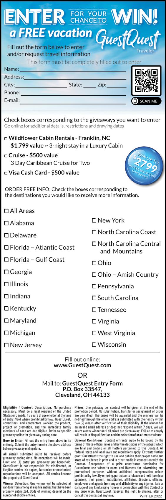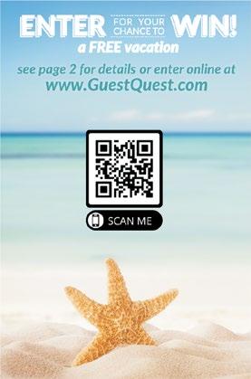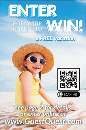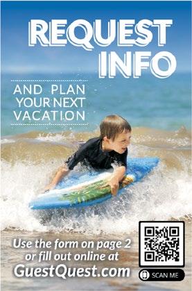 GuestQuest Traveler Vacation Guide takes you on a guided tour to various vacation locations. We feature information about accommodations, attractions and activities in many travel and vacation destinations. Providing you with article coverage on our advertisers, their amenities and services will assist you in making the right decision on choosing your accommodations, recreation, entertainment and more. Visit us at www.GuestQuest.com for additional advertiser information and links to their web sites. Distributed three times a year, Spring, Summer and Winter, with separate editions to Ohio, Pennsylvania, New York, Illinois/Indiana, North Carolina, Georgia/Alabama, Tennessee/ Kentucky and Virginia. Serving our advertisers and readers since 1984. For advertising information, questions or comments, call 1-800-644-8460. P. O. Box 33547, Cleveland, OH 44133. The accuracy of the information contained in these listings is the responsibility of each individual advertiser. Every effort has been made to offer upto-date information. Reproduction of editorial or graphic content in any manner without written consent of the editor is prohibited.