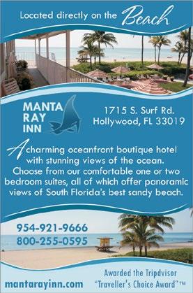 The Manta Ray Inn, located in Hollywood Beach, is a charming oceanfront Boutique Hotel with stunning views of the ocean. Choose from comfortable one or twobedroom suites, all of which offer panoramic views of South Florida’s