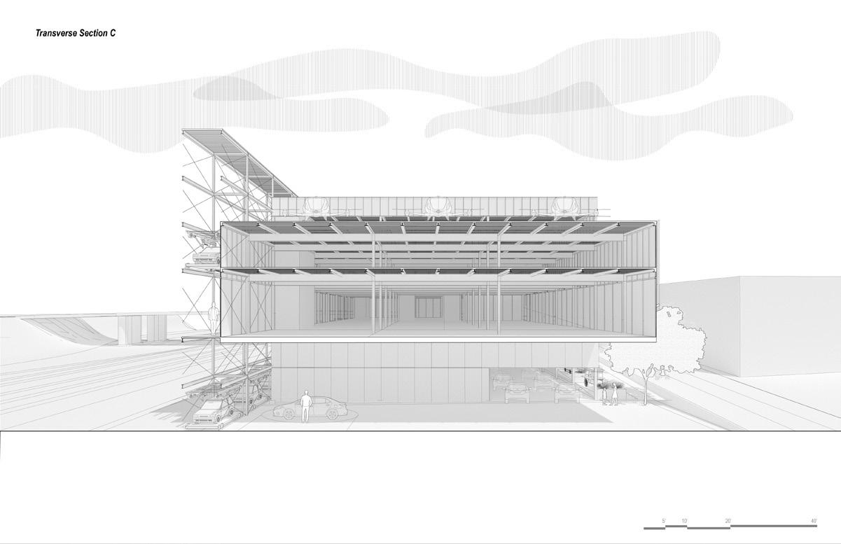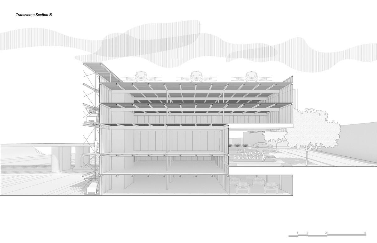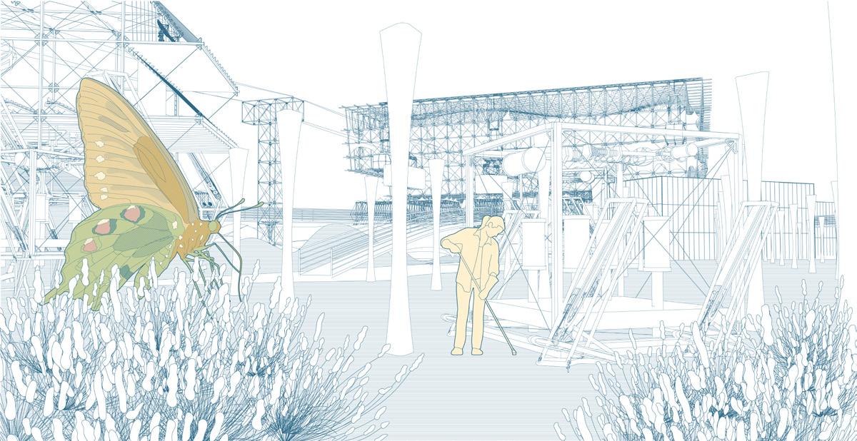 Thus, the evolution of the site is just as important as the design of the building itself. The building, elevated above the landscape, creates space for both technology and nature to thrive. It is a machine of observation that provides opportunities to be observed. The conservation, nurturing, and cohabitation of nature and human relations are of the utmost importance to the functioning of the machine.