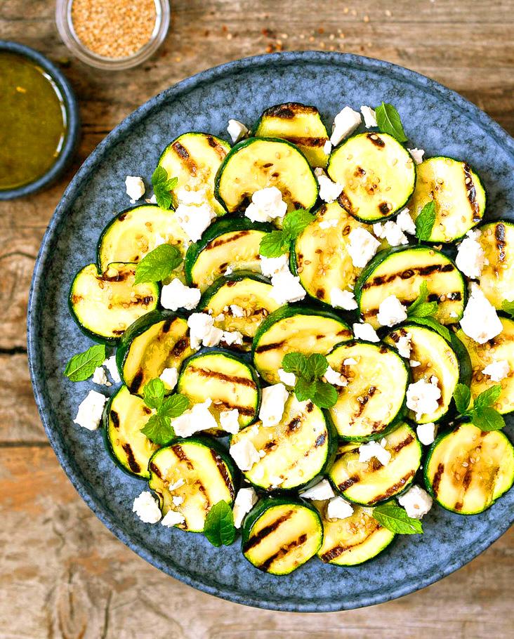 Emplatamos la ensalada colocando los discos de calabacín en una fuente con el queso feta desmigado por encima, hojas de menta frescas (cantidad al gusto) y espolvoreando con las semillas de sésamo. Regamos con el aliño y servimos.