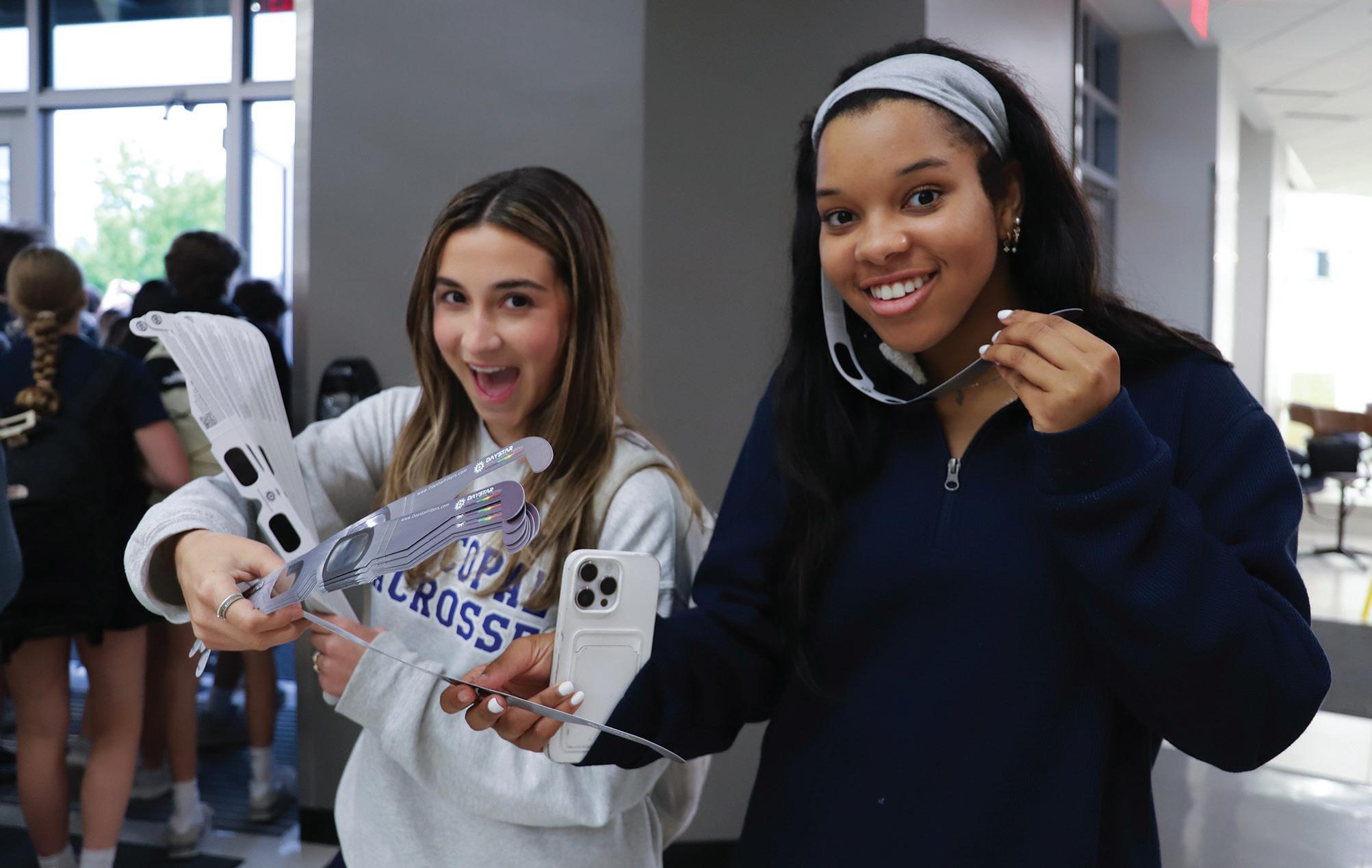 Senior Emerson Rippstein and junior Grace Gray help pass out solar eclipse glasses to students and faculty after the presentation in the Underwood Theatre. Photo by Sloane Wallace.
