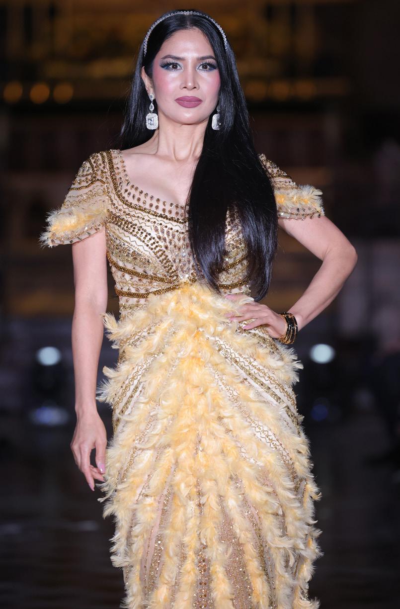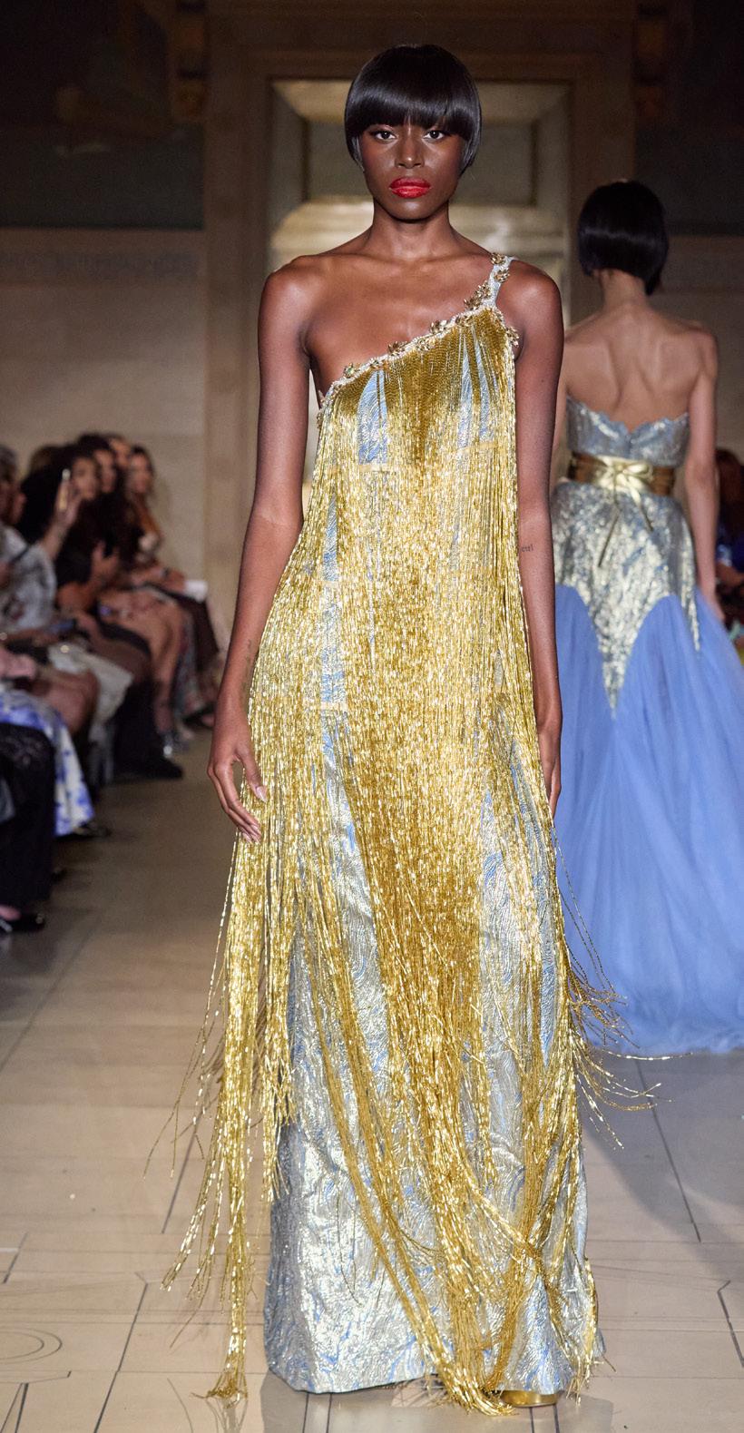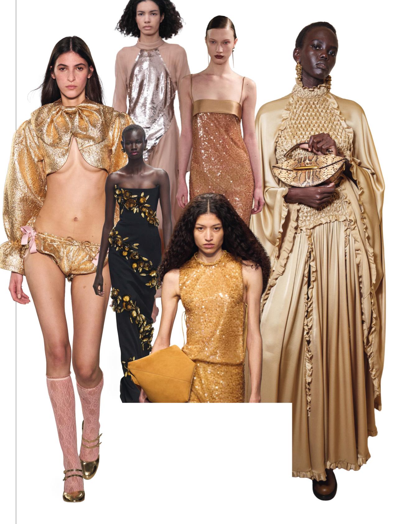If there is ever a moment to embrace head-totoe gold, it is now. Take the cue from Carolina Herrera, Balmain, and Alberta Ferretti, whose stunning bronze and brown looks shimmered with embellishment and high shine, reminiscent of everyone’s favorite tooth-cracking toffee treat.