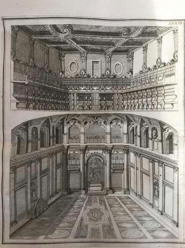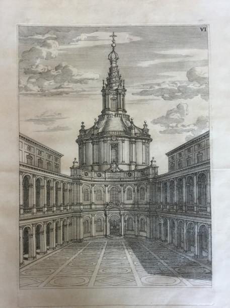 Sotto, uno spaccato dell’Oratorio dei Filippini (1637-50) verso l’altare e la libreria alzata, e accanto una veduta della facciata della Chiesa di Sant’Ivo alla Sapienza (1642-60), rispettivamente tratti dall’Opus Architectonicum di Borromini e dall’Opera, pubblicazioni fondamentali per illustrare le invenzioni borrominiane. Interrotto dalla sua morte, il grande progetto editoriale voluto dall’architetto stesso per spiegare “dall’interno”, attraverso apparati illustrativi e scritti, la sua visione, venne realizzato a inizio Settecento dall’editore Sebastiano Giannini.