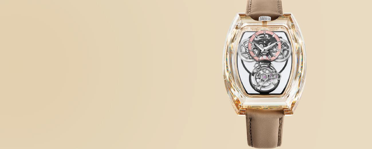 La moissanite, un carburo di silicio di origine cosmica, viene introdotta nell’alta orologeria da ArtyA per creare un innovativo orologio-cristallo. Questo materiale estremamente duro e luminoso amplifica la luce, trasformando la cassa in una lente ottica che esalta il movimento interno. Il risultato è un segnatempo unico, in cui design curvilineo e tourbillon si fondono in un gioco spettacolare di luce e meccanica.