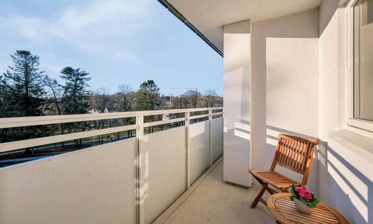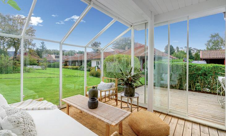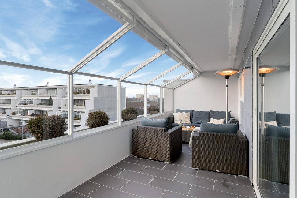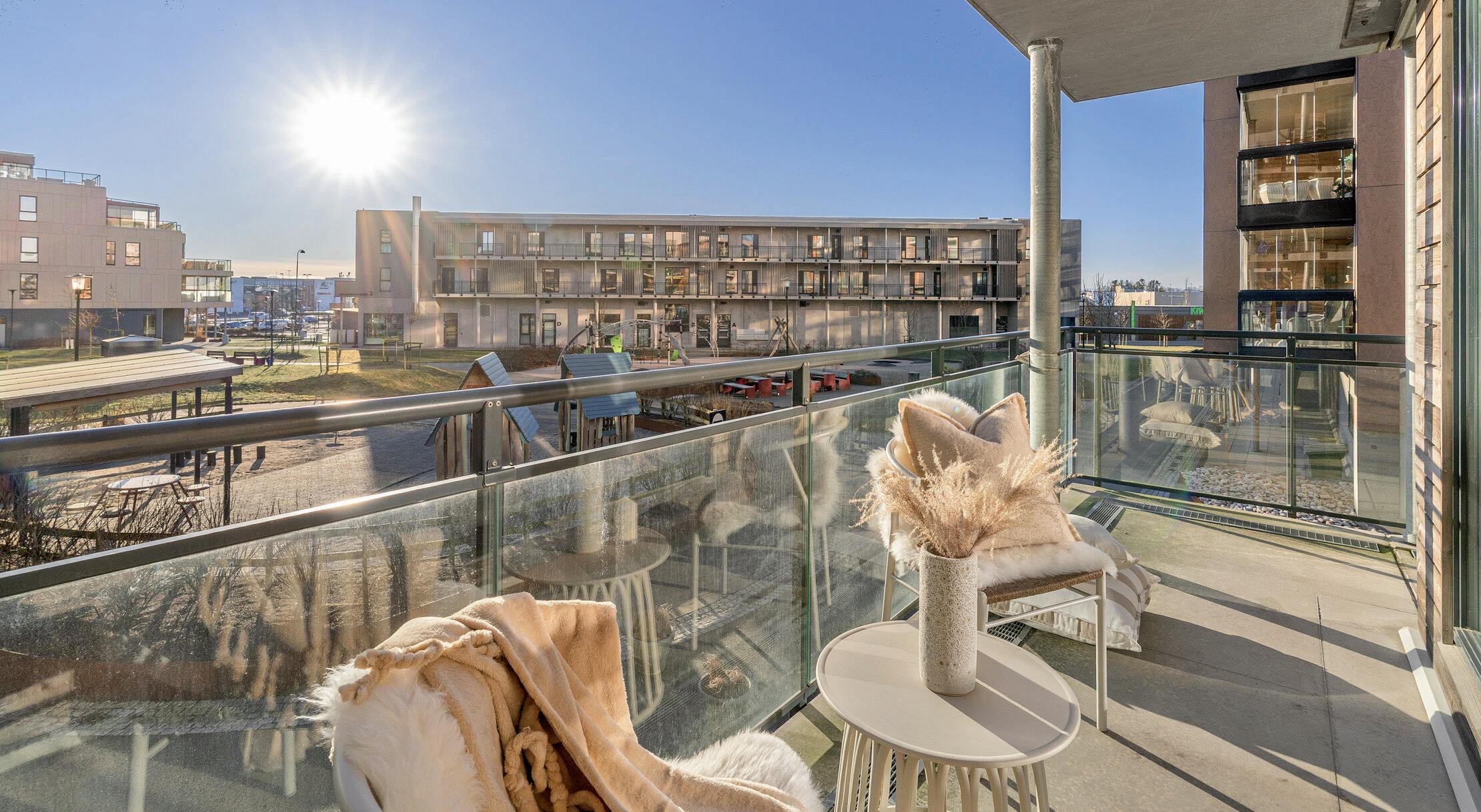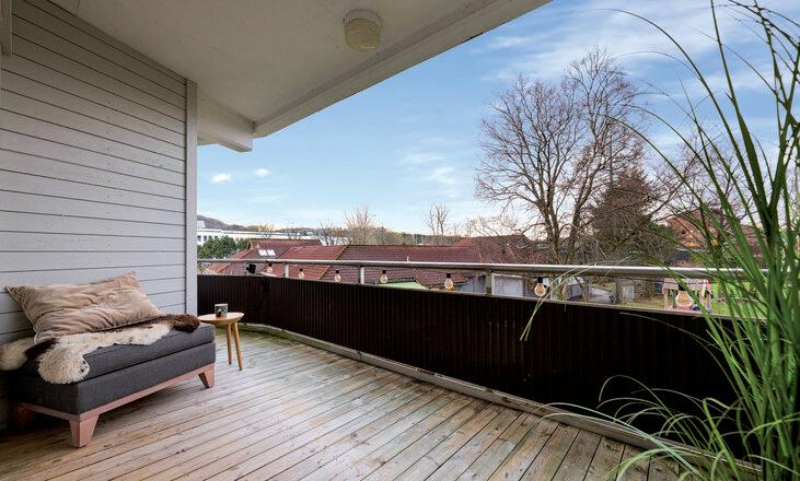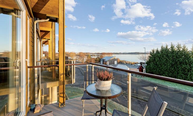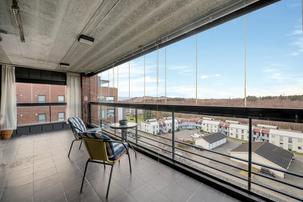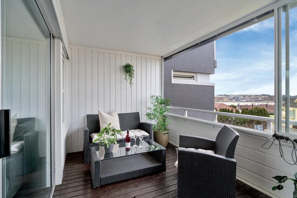 * Stor, innglasset balkong mot vest med fin utsikt og gode solforhold. Vinduene kan skyves til side etter vær og vind