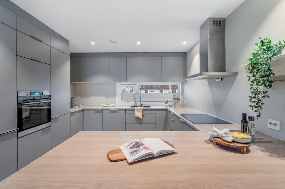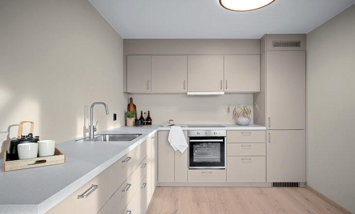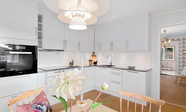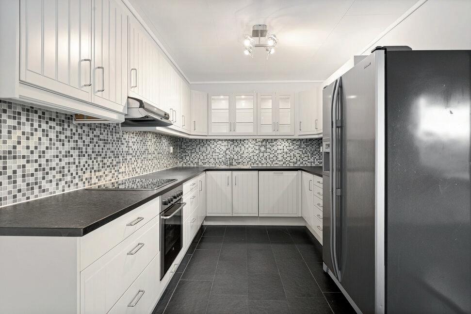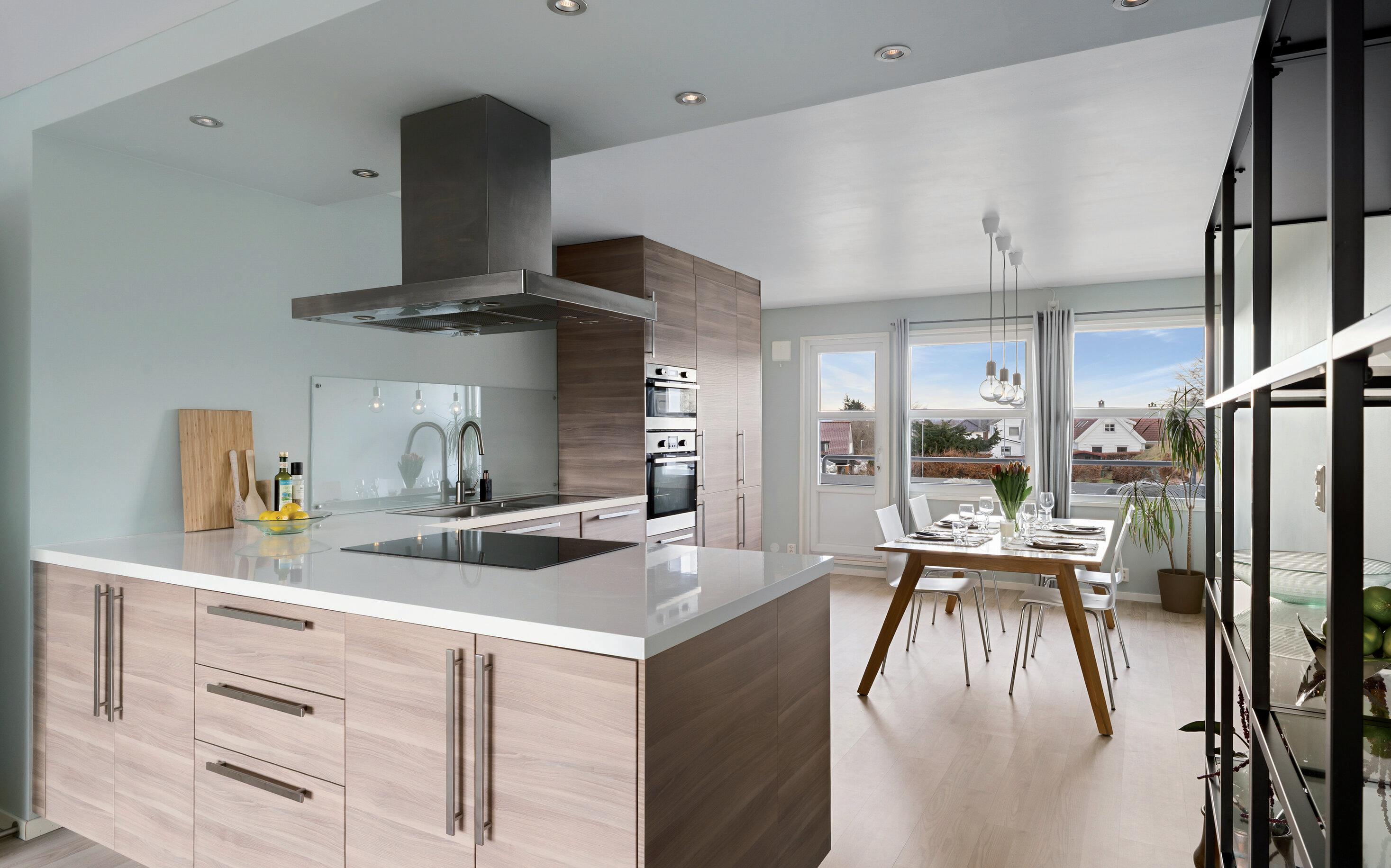 - Lekkert kjøkken med integrerte hvitevarer.