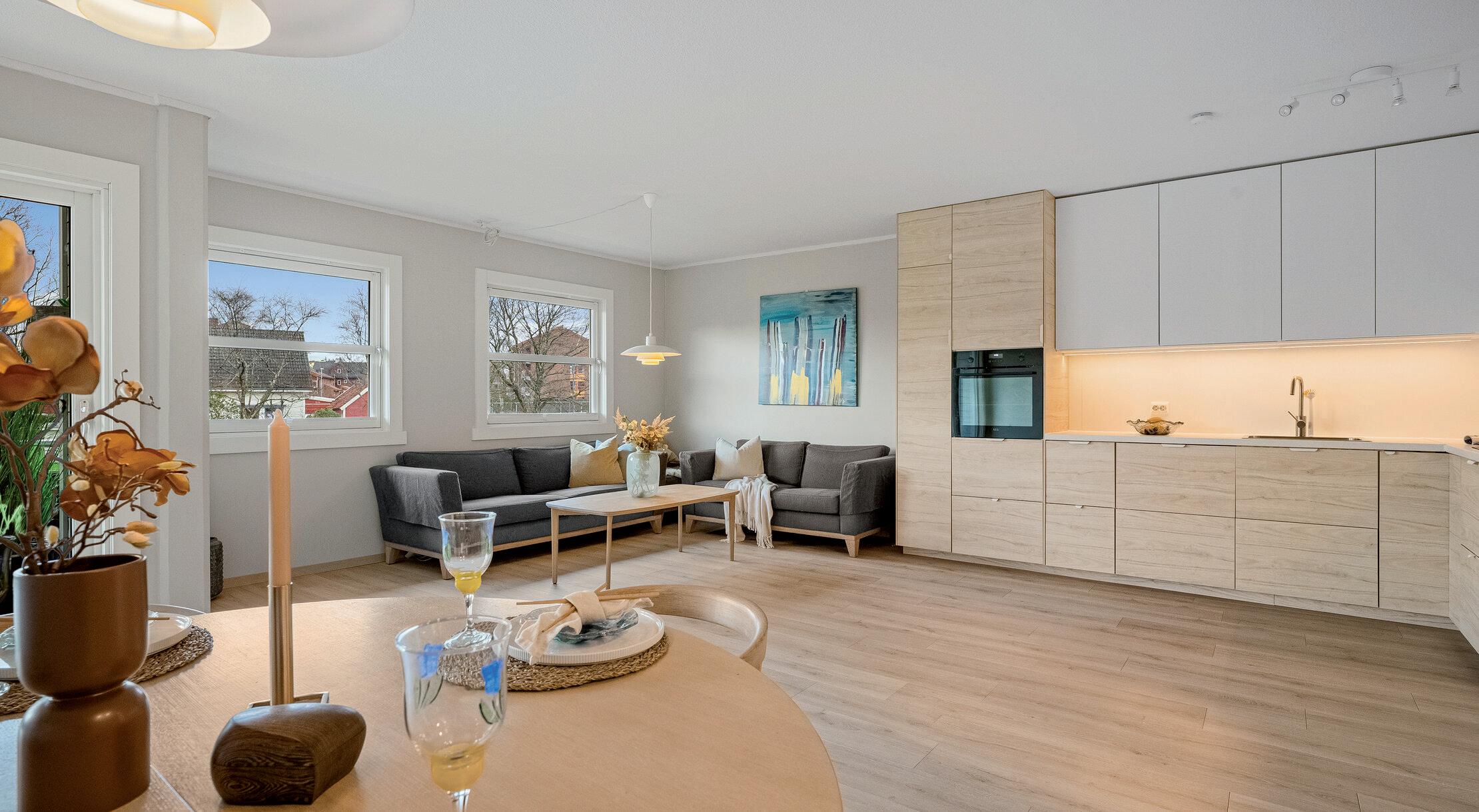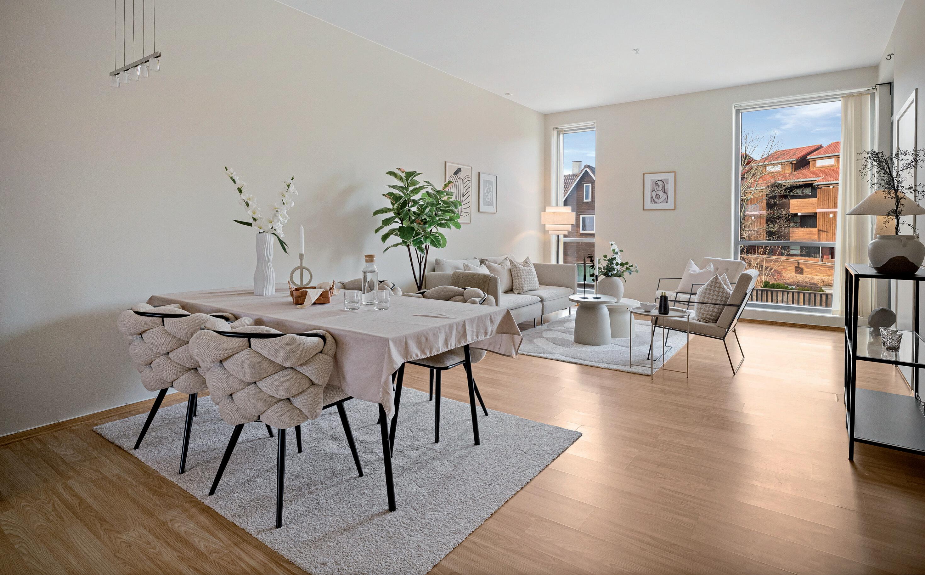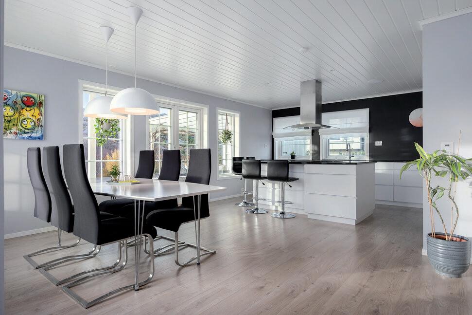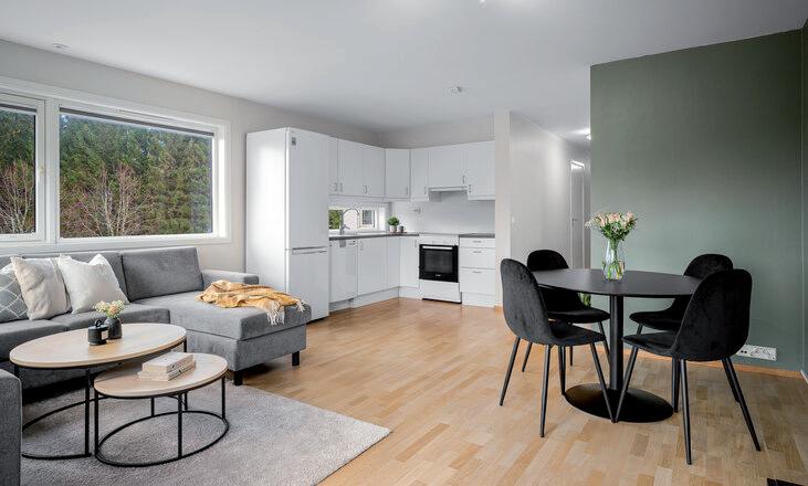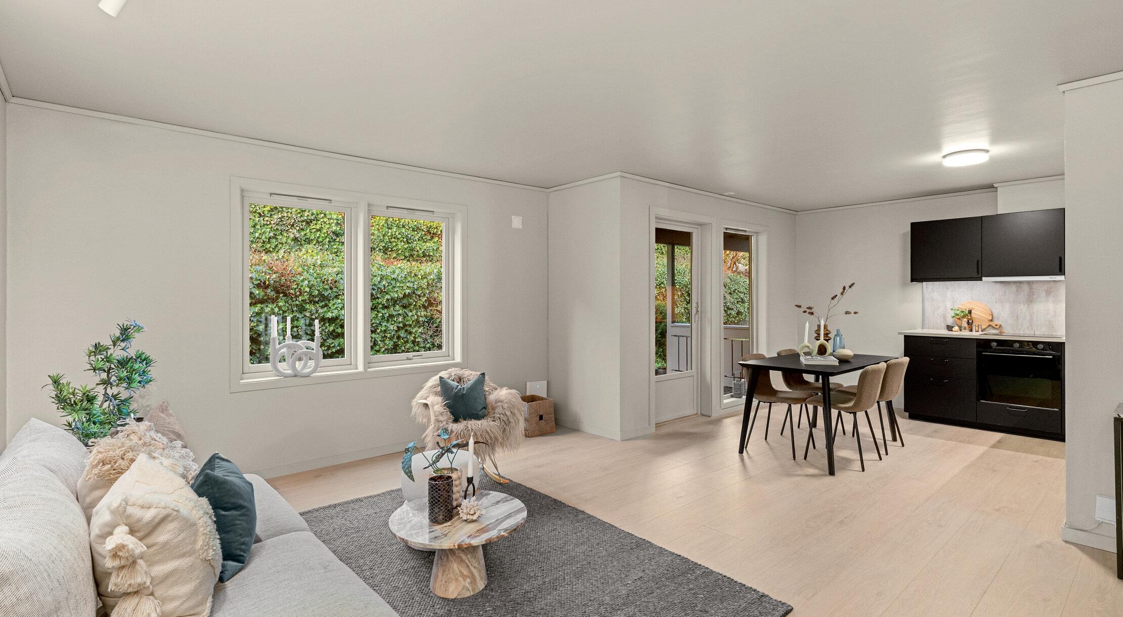 - Åpen stue- og kjøkkenløsning med god plass til sofagruppe og spisebord.