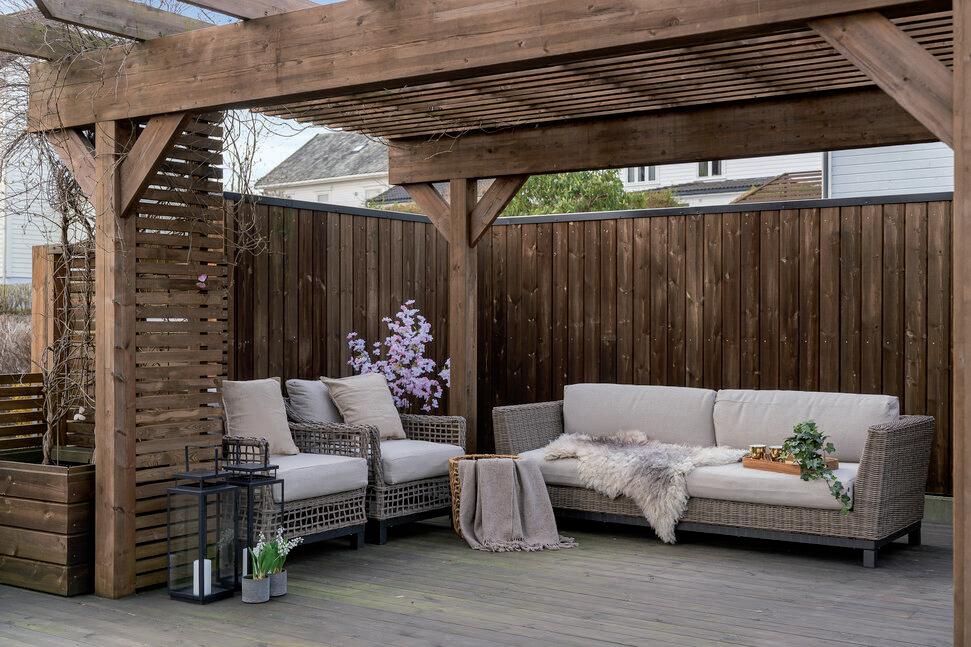 Solrik og romslig terrasse på hele 96 kvm med pergola, og pent opparbeidet hage.
