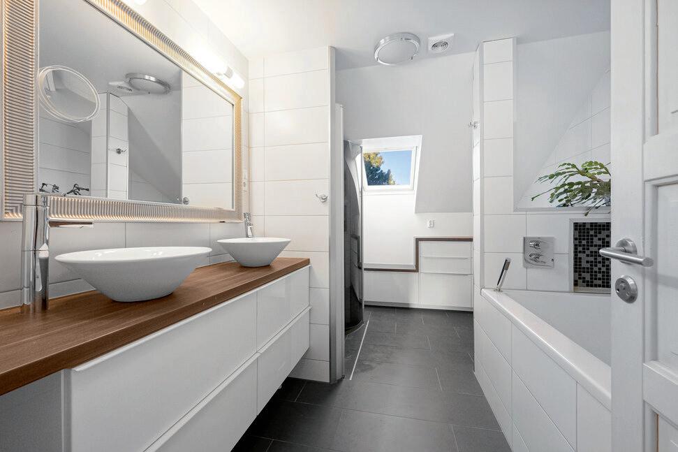 I øverste etasje ligger soveromsfløyen med fire soverom, som like gjerne kan brukes som kontor eller hobbyrom. Her finnes også et romslig, flislagt bad med badekar, dusj og dobbel servant. Midt i etasjen ligger en loftstue – perfekt som TVstue eller en roligere sone når hovedetasjen er i bruk.