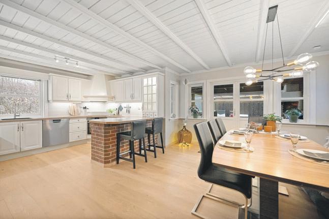Hovedetasjen rommer kjøkken og stue i en åpen og luftig løsning, med store vindusflater fra gulv til tak og direkte utgang til hagen. Her ligger alt til rette for middagsselskaper en sommerkveld med grilling på terrassen, eller lune kvelder foran peisen i tegl, som både gir varme og stemning. En praktisk bi inngang direkte til kjøkkenet gjør hverdagen enklere når handleposene raskt skal inn fra regnet.