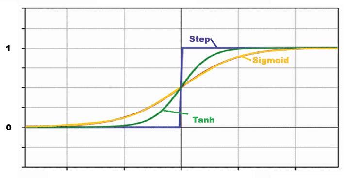 • Step: Produces discrete outputs (e.g., 0 or 1) depending on whether the input crosses a threshold