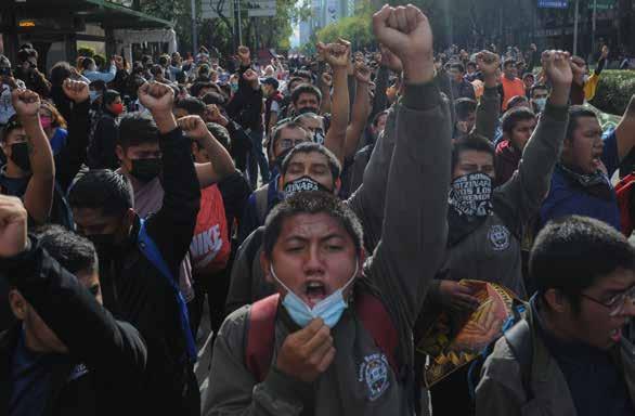 Puño en alto. Miles de personas marcharon este lunes en diversas ciudades del país, al cumplirse ocho años de la desaparición de 43 estudiantes de la normal rural Raúl Isidro Burgos de Ayotzinapa.