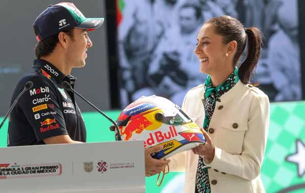 LA JEFA DE GOBIERNO, Claudia Sheinbaum, hizo a un lado su aversión a las carreras de autos —a las que tachó de “fifís”— y este jueves aceptó un casco que le regaló Checo Pérez, durante el arranque de actividades del Gran Premio de México 2022. Foto: Cuartoscuro.