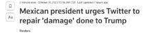 El presidente Andrés Manuel López Obrador dio una serie de consejos a Elon Musk, nuevo propietario de la red social Twitter. Opinó que la plataforma debería deshacer el “daño” causado al expresi dente de Estados Unidos, Donald Trump, por la cancelación de su cuenta y expresó su esperanza de que Musk frene la cen sura. cutt.ly/tNRXS9a
