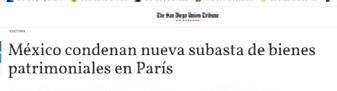El gobierno mexicano condenó la subas ta de 85 bienes arqueológicos que for man parte del patrimonio cultural del país. The San Diego Union Tribune publi có que el evento es organizado por Mai son de Ventes Aux Enchéres Millon et Associés en París, Francia, con bienes prehispánicos protegidos por las leyes mexicanas. bit.ly/3itNBWT