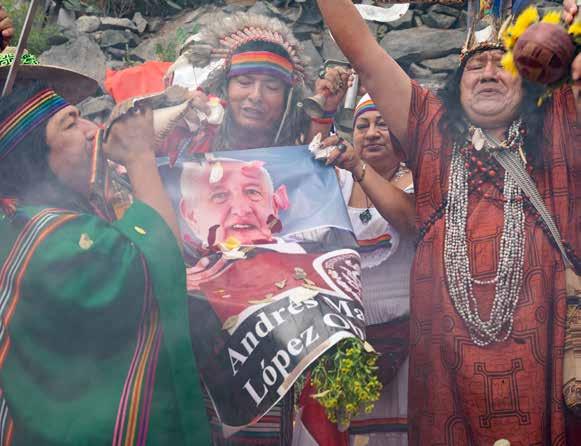 CHAMANES PERUANOS equipados con hojas de coca, espadas, incienso y una serpiente viva sostienen un cartel del presidente Andrés Manuel López Obrador, mientras ejecutan un ritual en la cima de un cerro sagrado de Lima, donde realizaron sus predicciones para el próximo año. Durante la ceremonia se hicieron limpias a imágenes de figuras como Pelé, Lula da Silva, Vladímir Putin y Volodymyr Zelenski Foto: AFP.