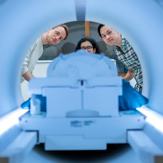 Los investigadores Alex Huth (izquierda), Jerry Tang (derecha) y Shailee Jain (centro) desde un escáner de resonancia magnética.