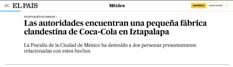 Autoridades de la Ciudad de México encontraron una pequeña fábrica clandestina de Coca-Cola en Iztapalapa. Al respecto, El País dio a conocer que elementos de la Policía de Investigación estaban tras un caso de robo de vehículos cuando encontraron unas instalaciones con un arsenal de botellas de Coca-Cola listas para ser rellenadas con un líquido de dudosa procedencia, así como sus respectivas cajas de plástico para transportarlas.