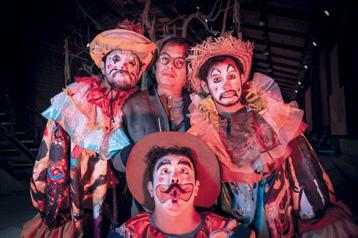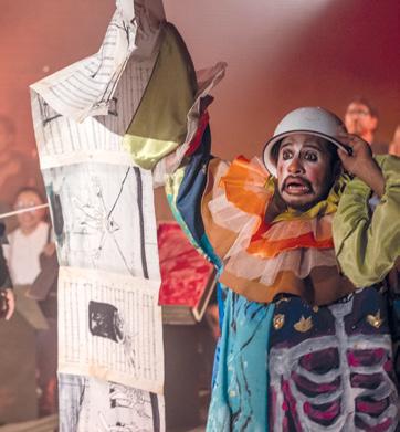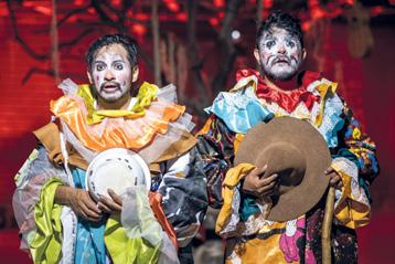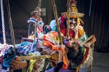 La puesta en escena evocó los antiguos panteones de los pueblos y propuso una reinterpretación contemporánea de la ma roma mixteca, práctica festiva de raíces acrobáticas y musicales. Con música en vi vo, danza y humor, el montaje articuló una visión compartida por artistas de distintas disciplinas, entre ellos el pintor oaxaqueño Sergio Hernán dez, quien intervino máscaras y vestuarios del elenco para convertirlos en piezas plásticas. En el centro simbólico de la obra se ubicó Manuel Montes, figura emblemática de la maro ma, recordado por haber encar nado por décadas al payaso, personaje esencial de esta tra dición. La maroma es una práctica sincrética, itineran te y comunitaria, presente en varias regiones de Méxi co, que combina poesía improvisada, canto, baile y acrobacias.