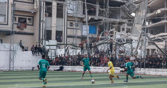EN GAZA, niños palestinos juegan futbol entre edificios destruidos, transformando el deporte en símbolo de resistencia y esperanza.