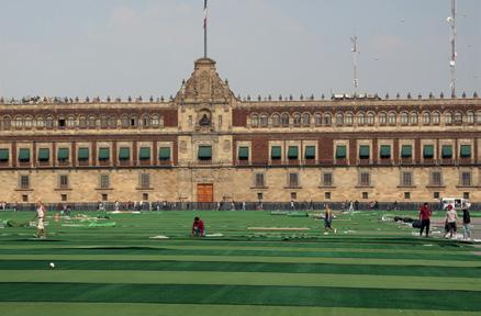 La plancha del primer cuadro se cubre con pasto artificial de dos tonos, a fin de prepararse para la clase masiva de futbol convocada para el próximo 19 de marzo, que lograría un nuevo Récord Guinness para la Ciudad de México.
