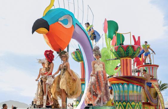 К Desfiles y comparsas: Coloridos carros alegóricos recorren el centro histórico, acompañados por danzas, música y disfraces que representan la identidad sinaloense.