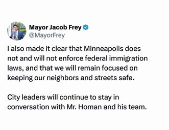 Pero Frey subió la apuesta poco después al señalar en X: “El trabajo de nuestra policía es garantizar la seguridad de los ciudadanos, no hacer cumplir las leyes federales de inmigración”.