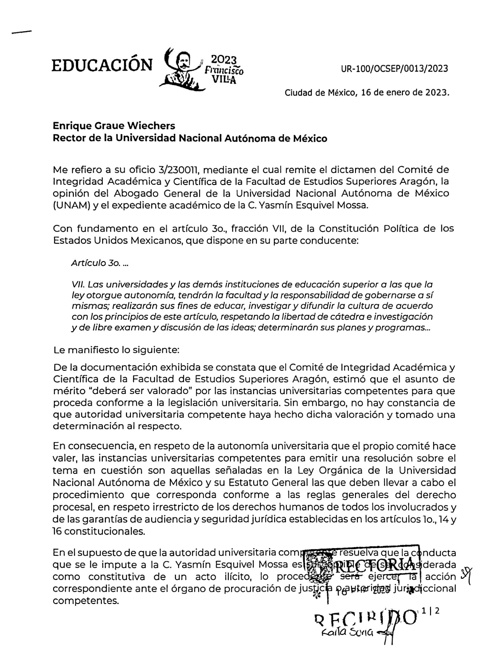 Respuesta de la SEP a la UNAM por caso de la tesis de la ministra Esquivel