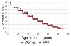 Among the 395 deceased doctors (aged 35-85 years), 351 were men and 44 were women (Table 2). The highest number of deaths occurred among male doctors aged 65-70 years (n=74). A few deaths were also noted in younger age groups: 3 doctors died between 35-40 and 2 between 40-45 years. The greatest reduction in life expectancy of 38.80 years was seen in the 35-40 age group (Fig 1). The average reduction across all doctors was 14.39 years (±6.60). Among men, life expectancy was reduced by an average of 13.66 years (±6.21), with a maximum of 38 years. For women, the average reduction was higher at 17.14 years (±8.28), with a maximum of 40 years in two individuals.