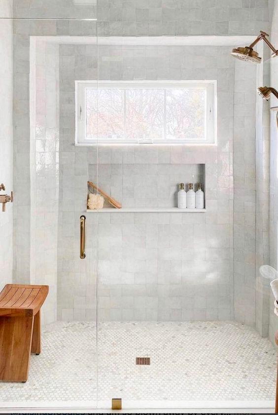 PRINCIPAL BATHROOM OPTION 1: Double vanity is a combination of stone and a timber face; the large walk in shower is a mix of zellige wall tiles and small ceramic floor tiles This option offers a pair of mirrors and wall sconces as well as more traditional fixtures