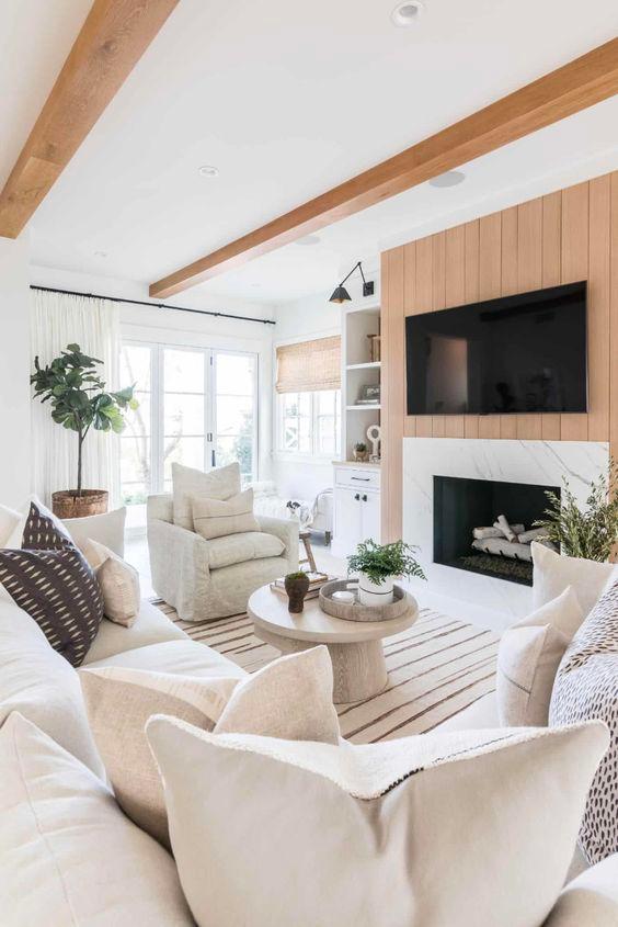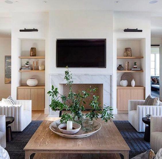 LIVING ROOM: The sectional centers around the TV and fireplace which can be flanked by built in cupboards or shelving Using a mix of materials, wood, stone and a painted finish adds layers to the room
