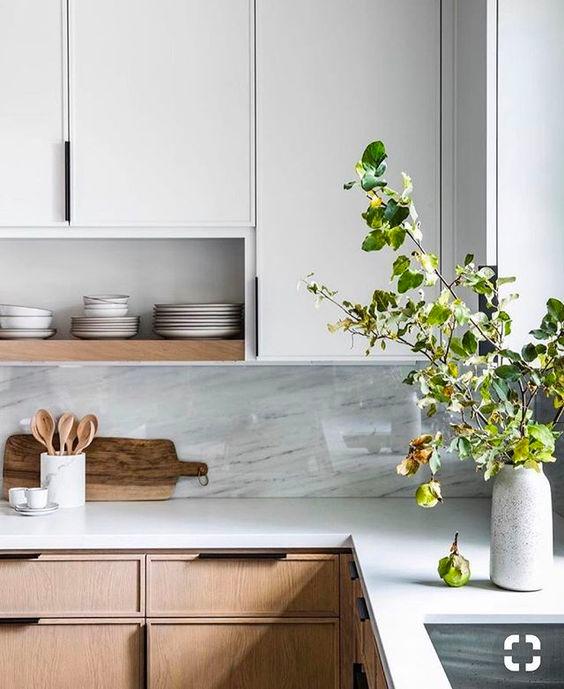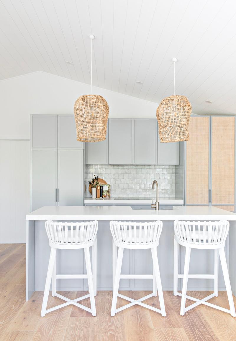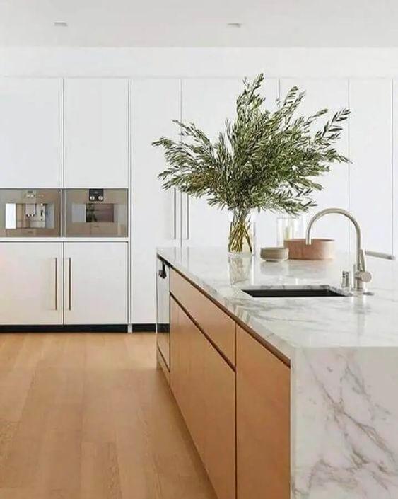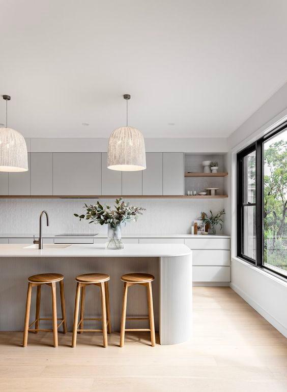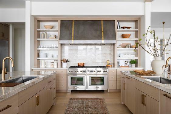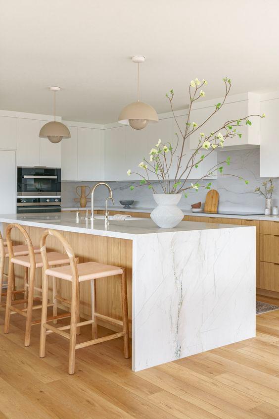 OPEN KITCHEN OPTION 1- Gather around a large central island with a waterfall edge The bright stone counters are offset by the timber finish on the cabinet doors Consider mixing in timber shelves within the cabinetry
