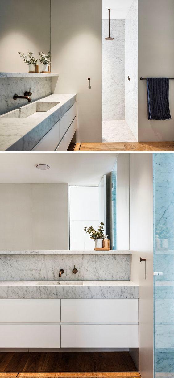 PRINCIPAL BATHROOM OPTION 2: Stone double vanity with a timber shelf below Large walk in shower is a monolithic installation of stone or stone effect ceramic tile This option has more contemporary wall mounted fixtures, and a single long mirror