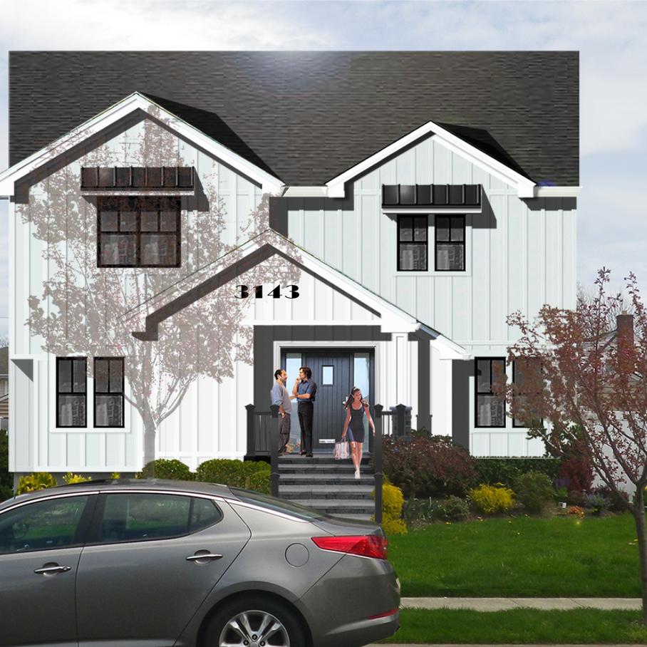 HOUSE EXTERIOR: The house exterior will be updated with new siding, a new roof, the addition of stone and an extension to give a formal entry In renovating the downstairs a new, light timber floor will be installed