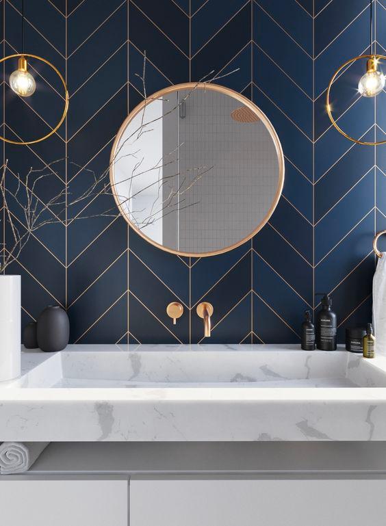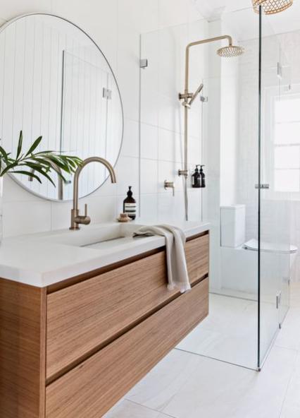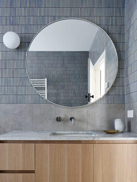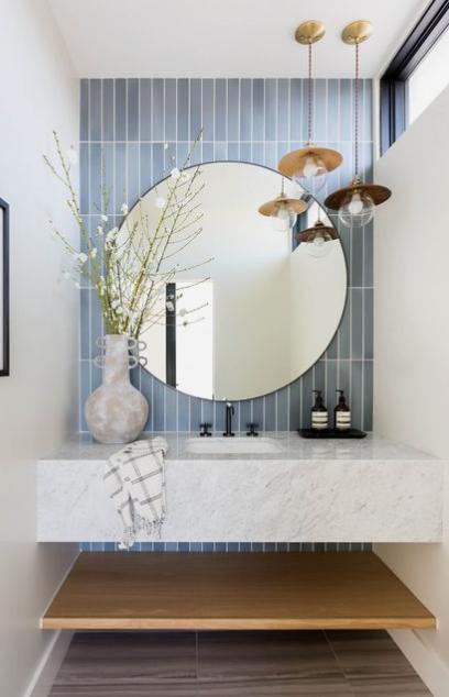 GUEST BATHROOM: Bringing a fresh update to the guest bath upstairs Far left- a b timber vanity Far right- the use of a blue accent tile at the sink or along the back wa all bathrooms- how much storage do you need?